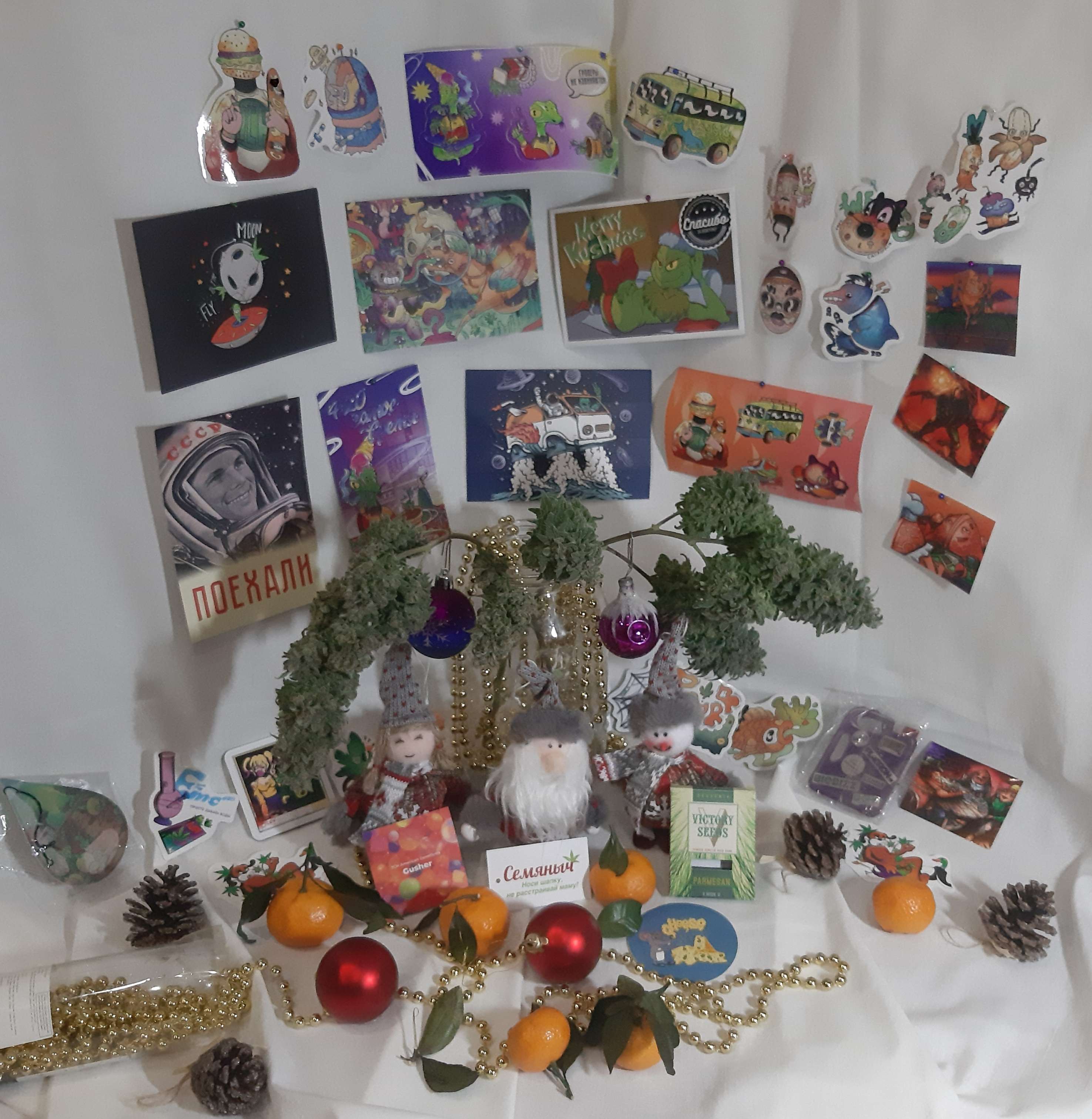Провёл последний харвест в этом году, централки на фото. Во время харвеста всегда есть время подумать.., руки заняты голова свободна, ага). И подумал я, что грех жеж не воспользоваться тем, что даёт Джа.., а он дал мне всё для участия в этом конкурсе: предновогодний харвест, возможность заходить сюда и учавствовать.., даже моя жена была свободна в день харвы, и помогла мне оформить композицию из присланных Семянычем наклеек, календарей, магнитов и пр. На победу не надеюсь.., конкурсы не выигрывал и с более серьёзным материалом..)