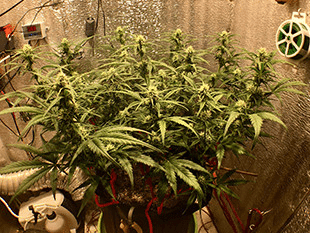 Следующие две недели гровер продолжал подвязывать колы, чтобы все соцветия получали одинаковое количество света. Периодически куст маникюрился. Его развитие было уверенным, но, по мнению гровера, медленным. Он как будто отставал от привычного темпа на 7-10 дней. В конце 8-й недели рост прекратился. Колы получились довольно вытянутыми, из-за чего имели длинные междоузлия.