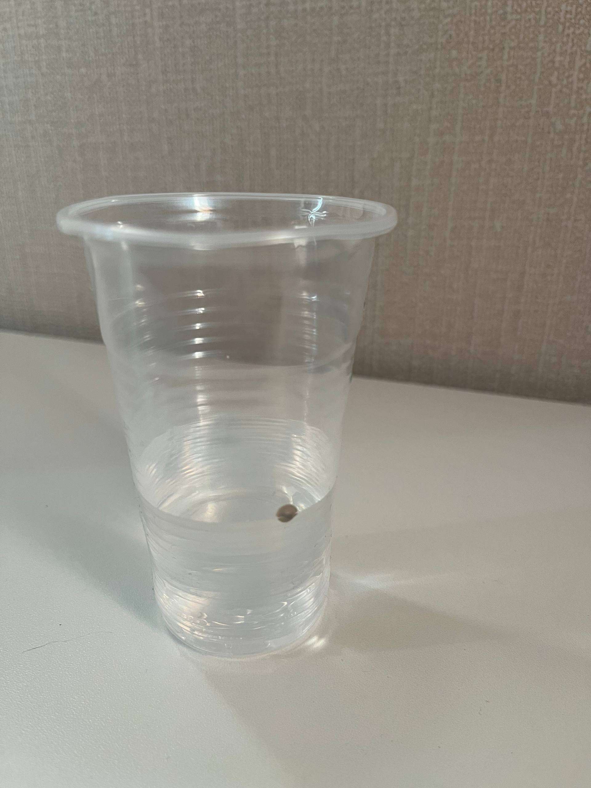 Взял пластмассовый стакан 200мл. Налил в него 50-70мл покупной воды «Святой источник» ппм 109. PH 6.93. Добавил перекись водорода 3% 10-13 капель. Закинул семечку в стакан и прибрал его в темное место в шкаф. Ждем.