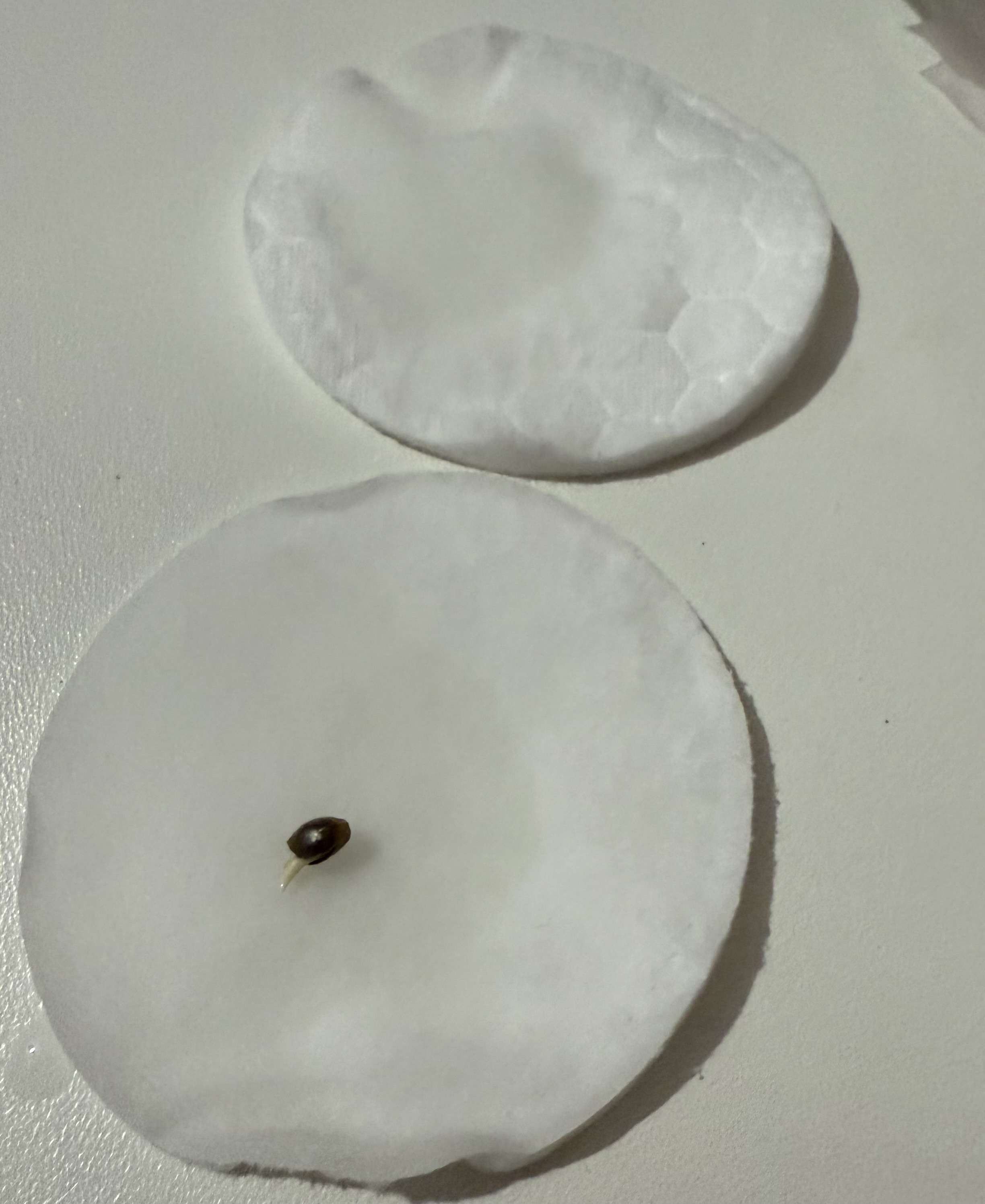 Утром достав влажный диск с семечкой, обнаружил что за ночь корень семечки вылез где то на 1см. Прошло ровно 2 дня. Пора высаживать нашу семечку.