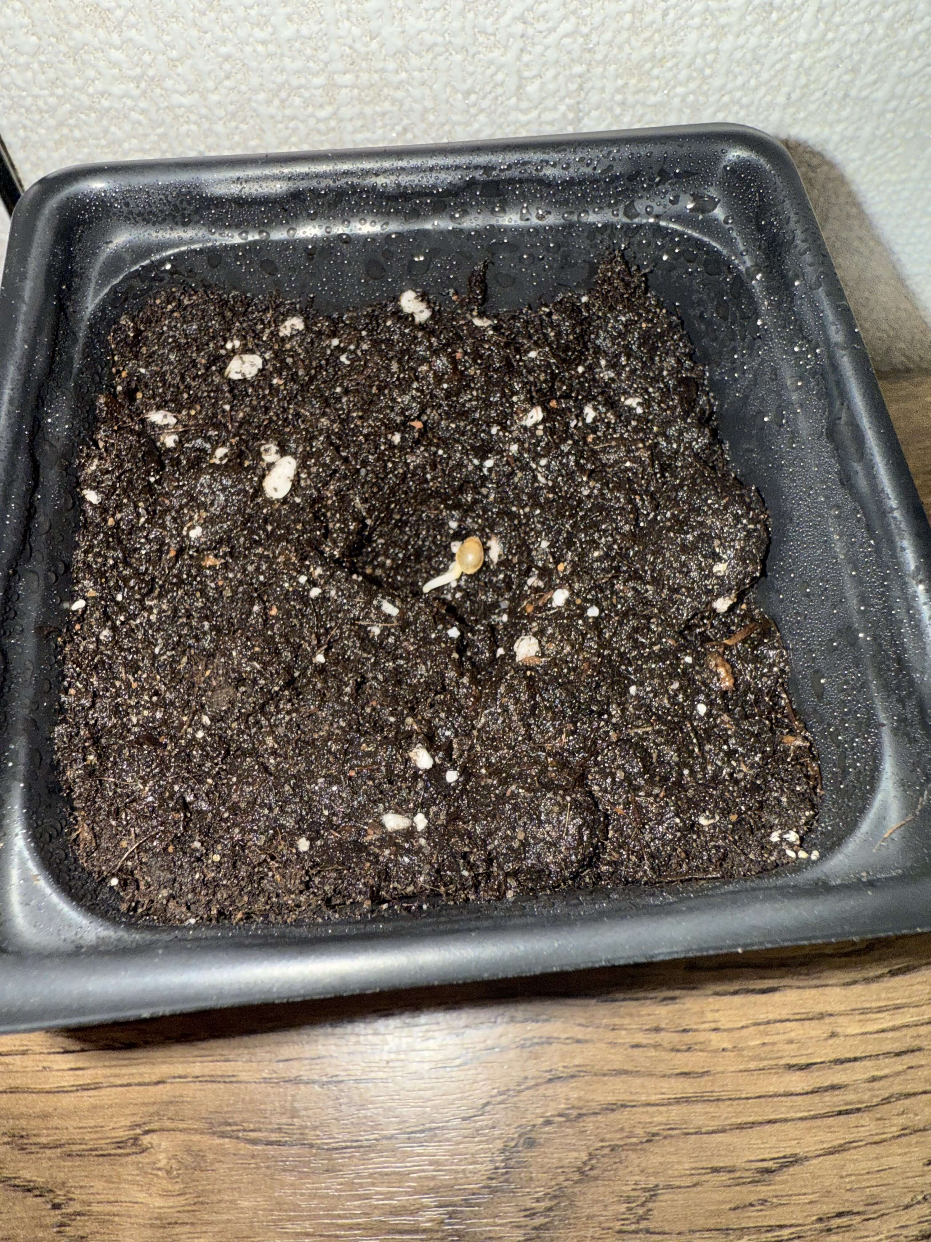 Прошло 24ч. Открыл шкафчик, что бы посмотреть как там семечка. Еле виден корешок. Вообщем еще как минимум сутки придется постоять. Ожидаем!