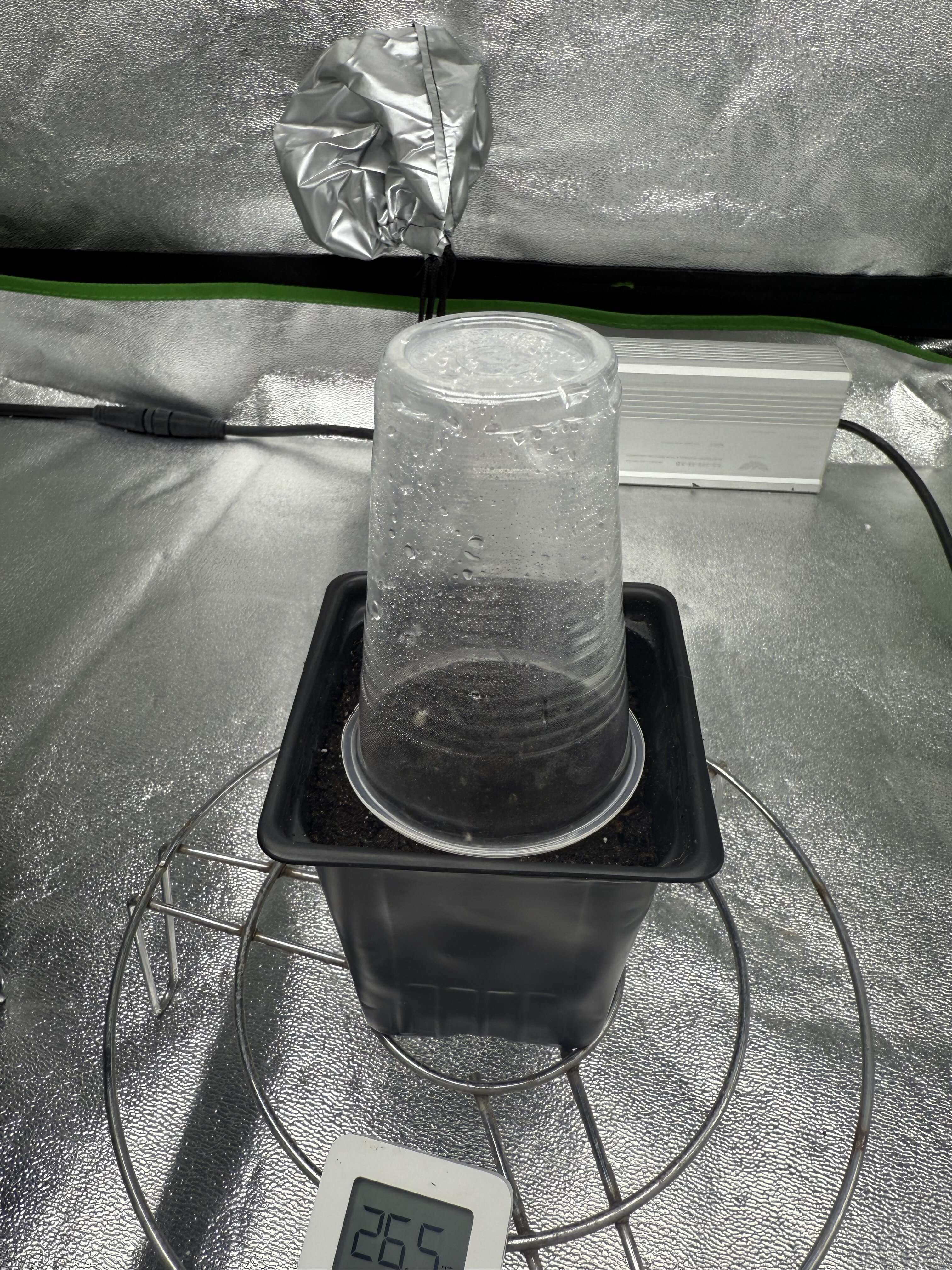 Спустя сутки залез в бокс, проверить как там растение. Подняв стаканчик, сразу заметил появление🌱Брызгнув пару раз с пулика. Накрыл стакан и закрыл бокс.