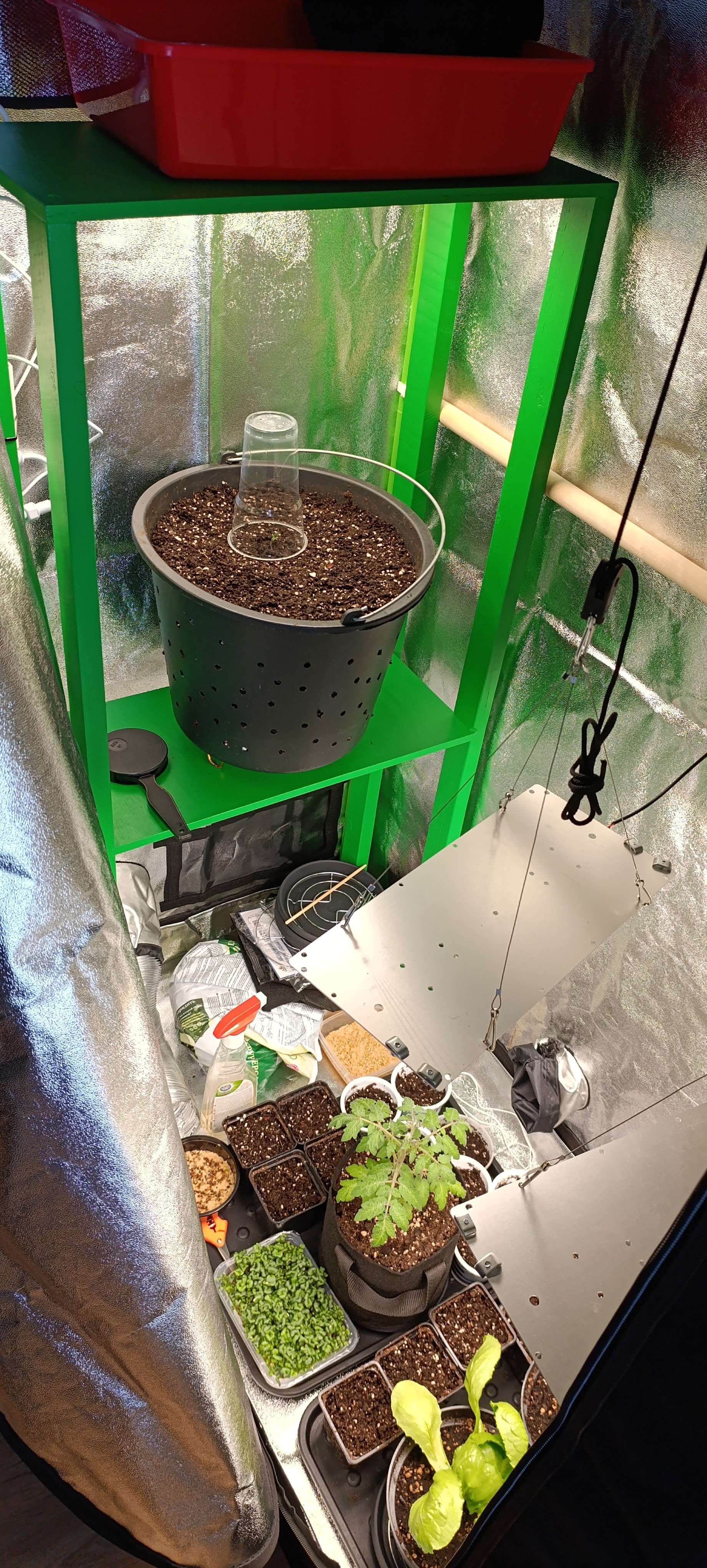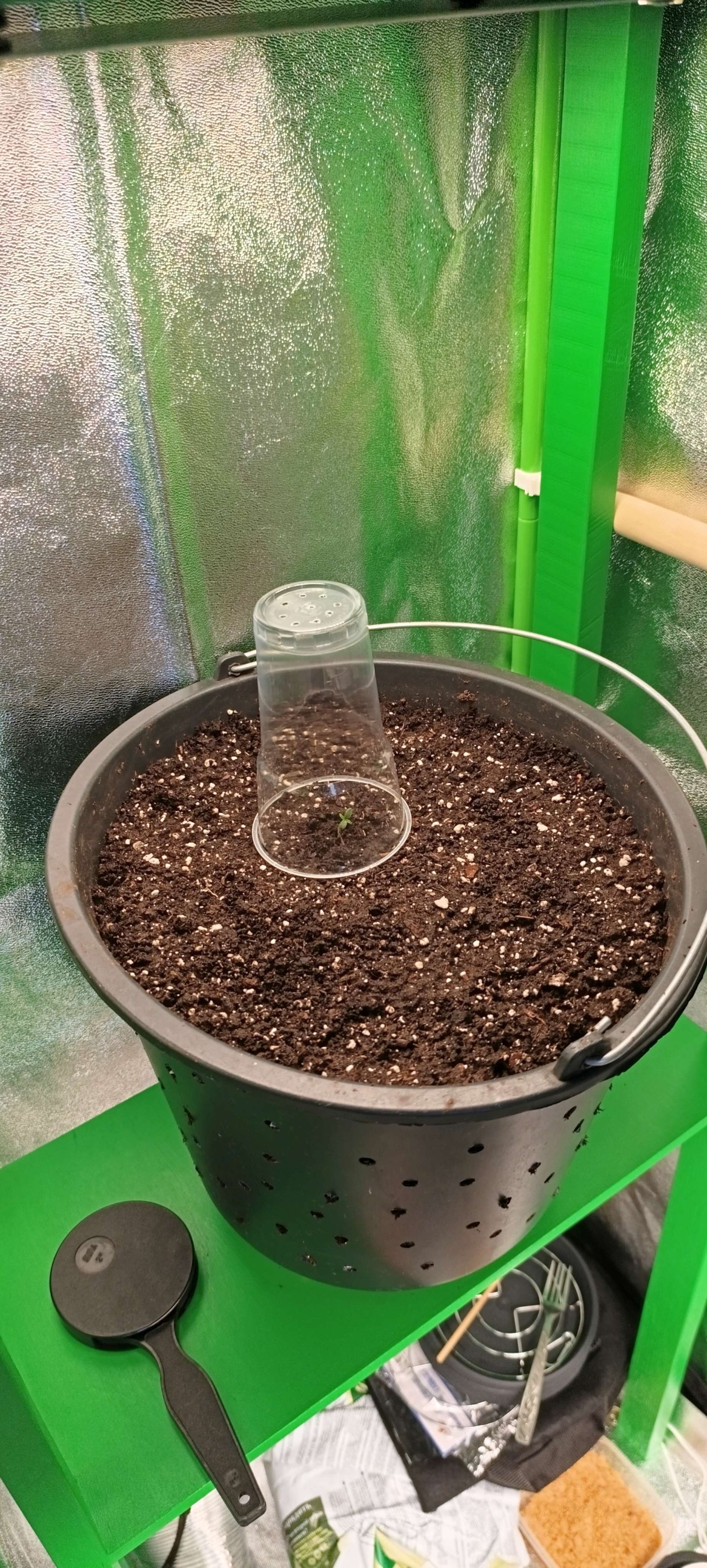 Подсыпали влажной земли. Растём под стаканчиком в гостях у помидорки, салатика и рассады))