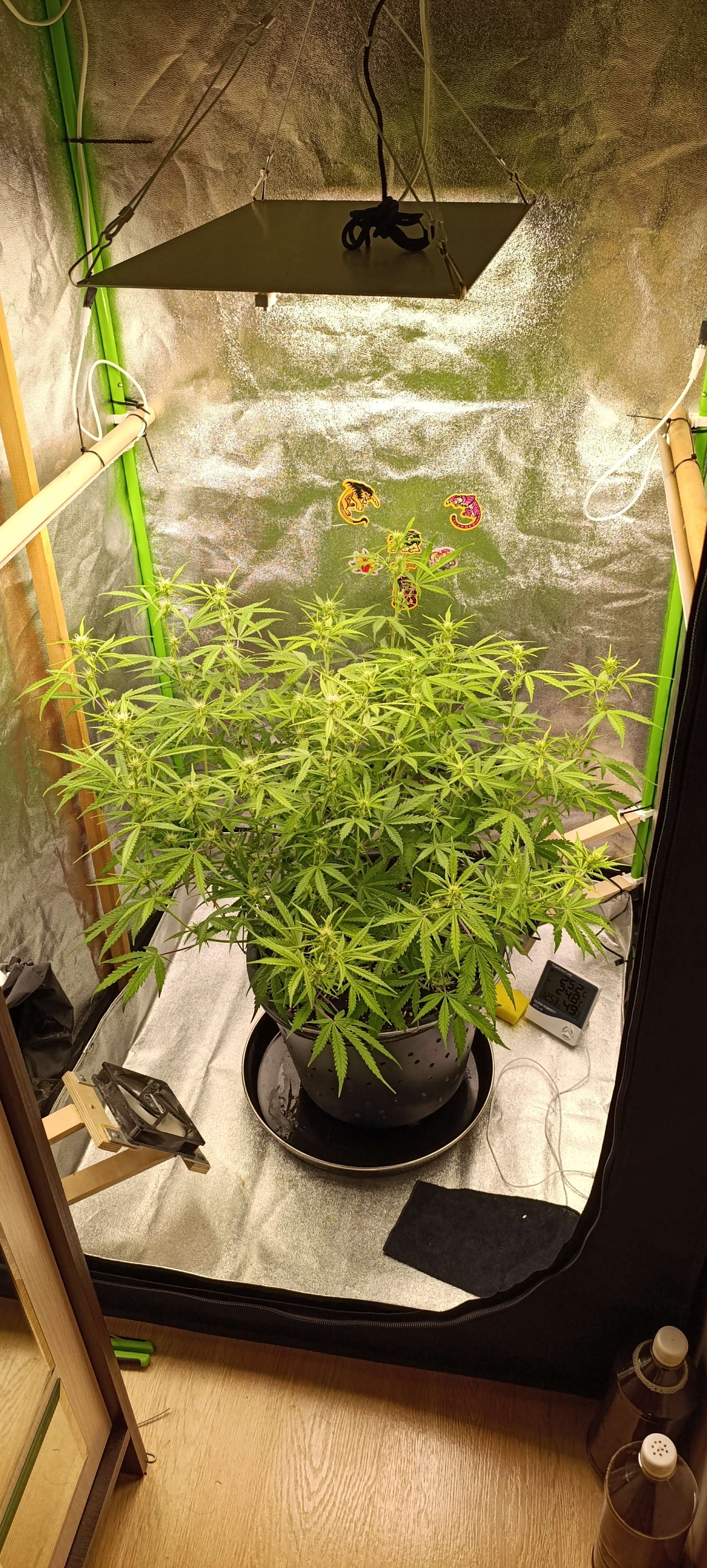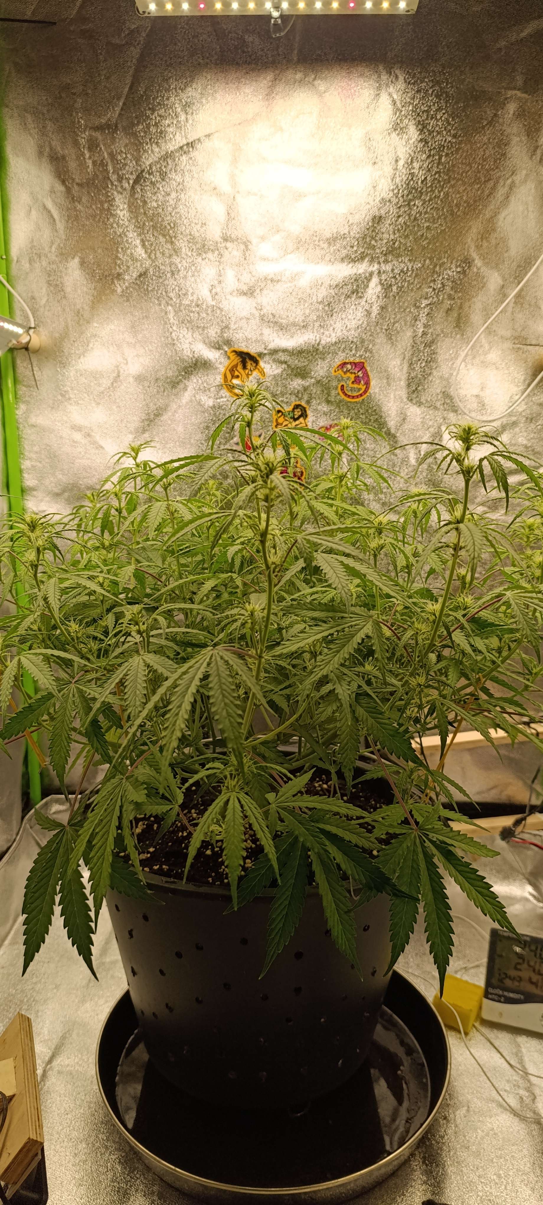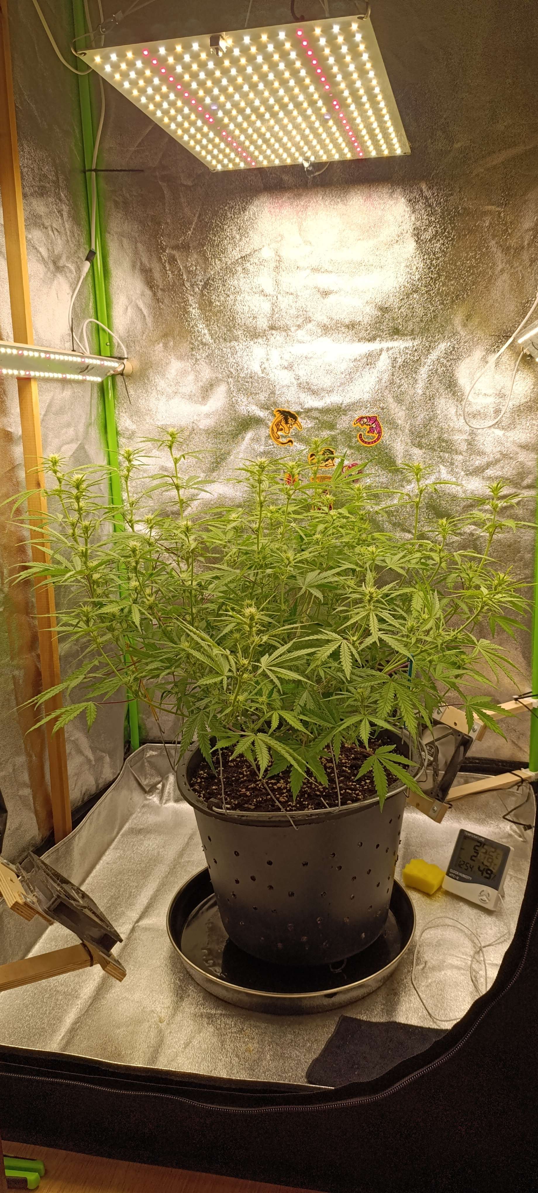 Полили компотом, четыре литра. Увеличиваем количество удобрений. Свет подняли до 39 000 LUX. Подрезали листву, сегодня удалили часть старых лопухов и чуть проредили середину.