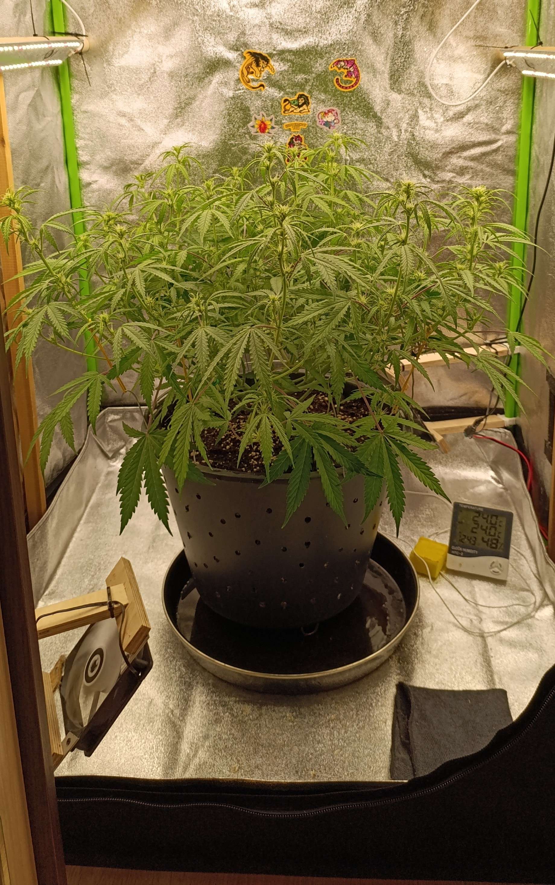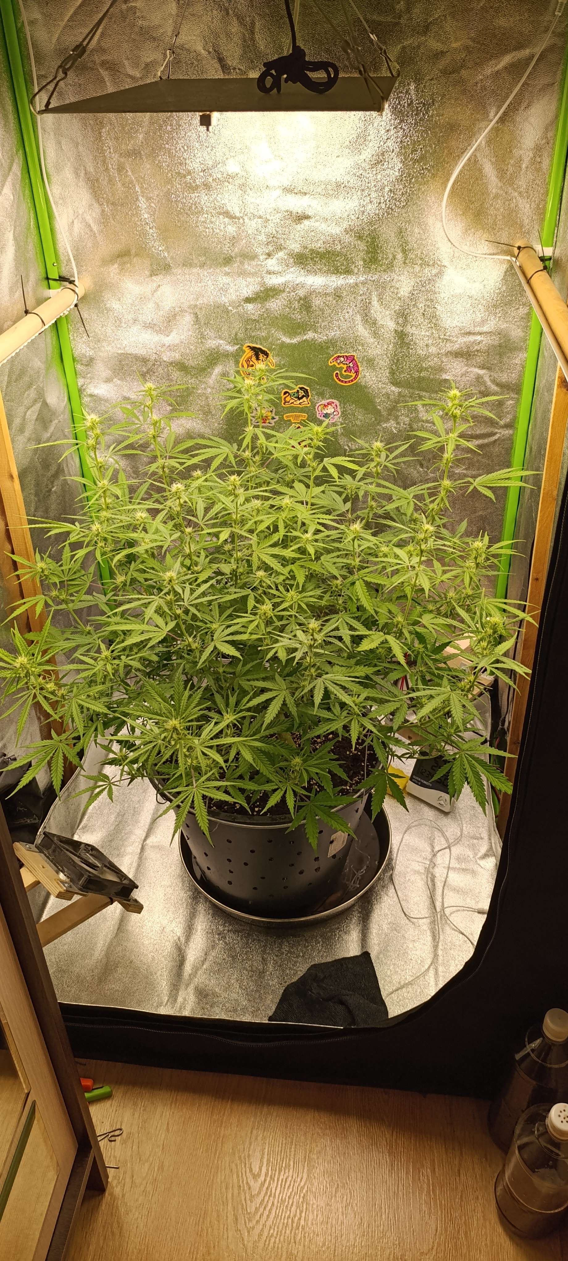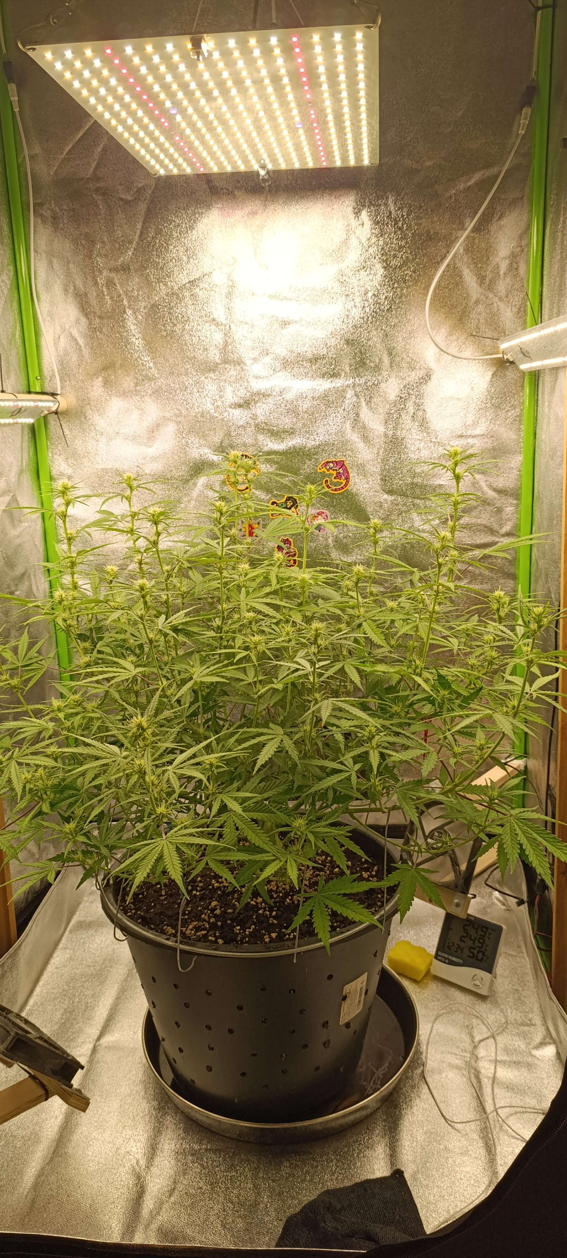 Полили компотом, четыре литра. Увеличиваем количество удобрений. Свет подняли до 39 000 LUX. Подрезали листву, сегодня удалили часть старых лопухов и чуть проредили середину.