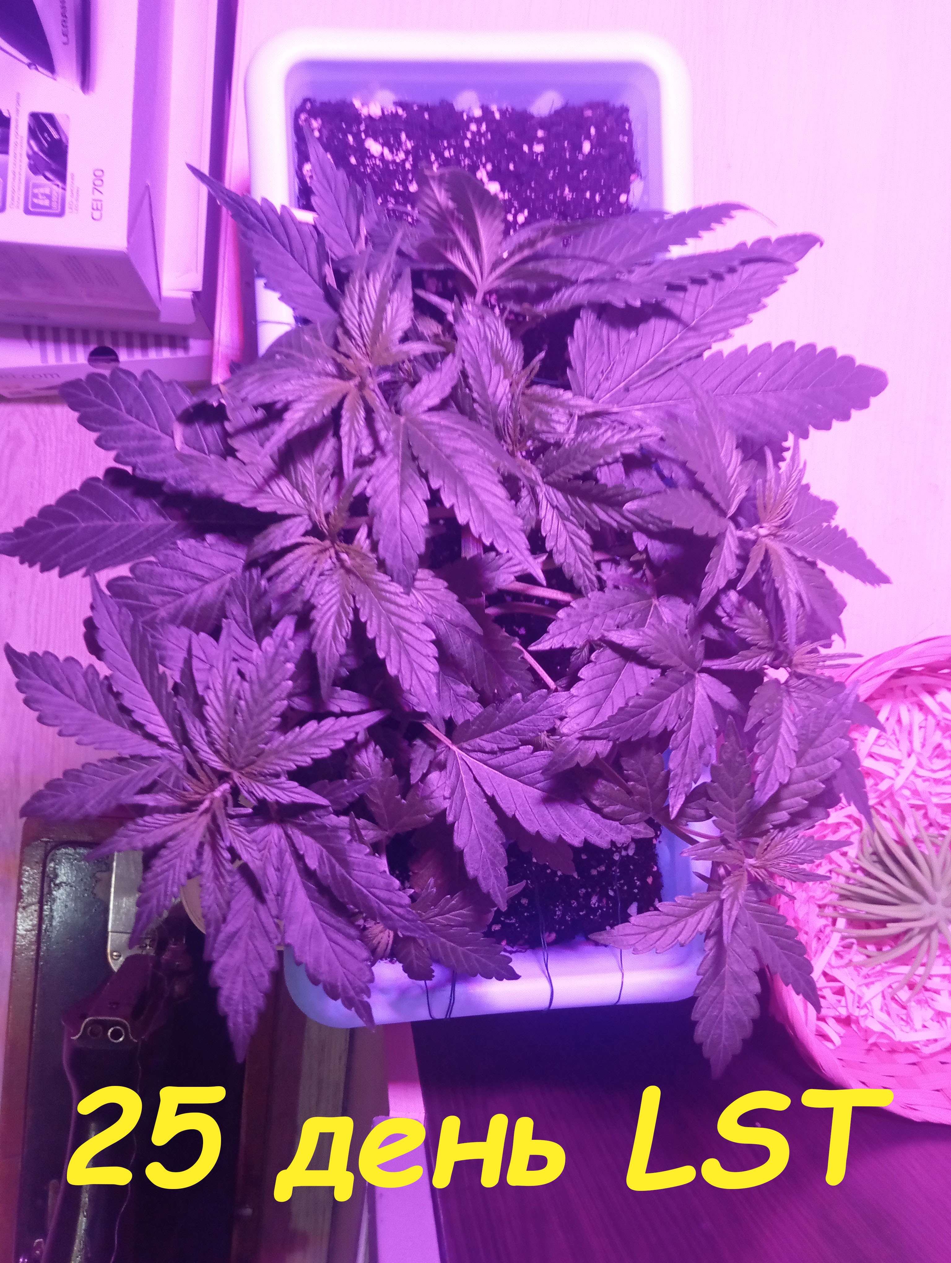 Так же ежедневно на пару часов выставлял куст под сутенерскую лампу, делаю Lst. В дни поливов снимаю проволоку, потом на следующий день снова формирую крону, ту же проволоку вешаю обратно. Очень удобно. В моем случае пластиковый гошок + проволака = мастхев.