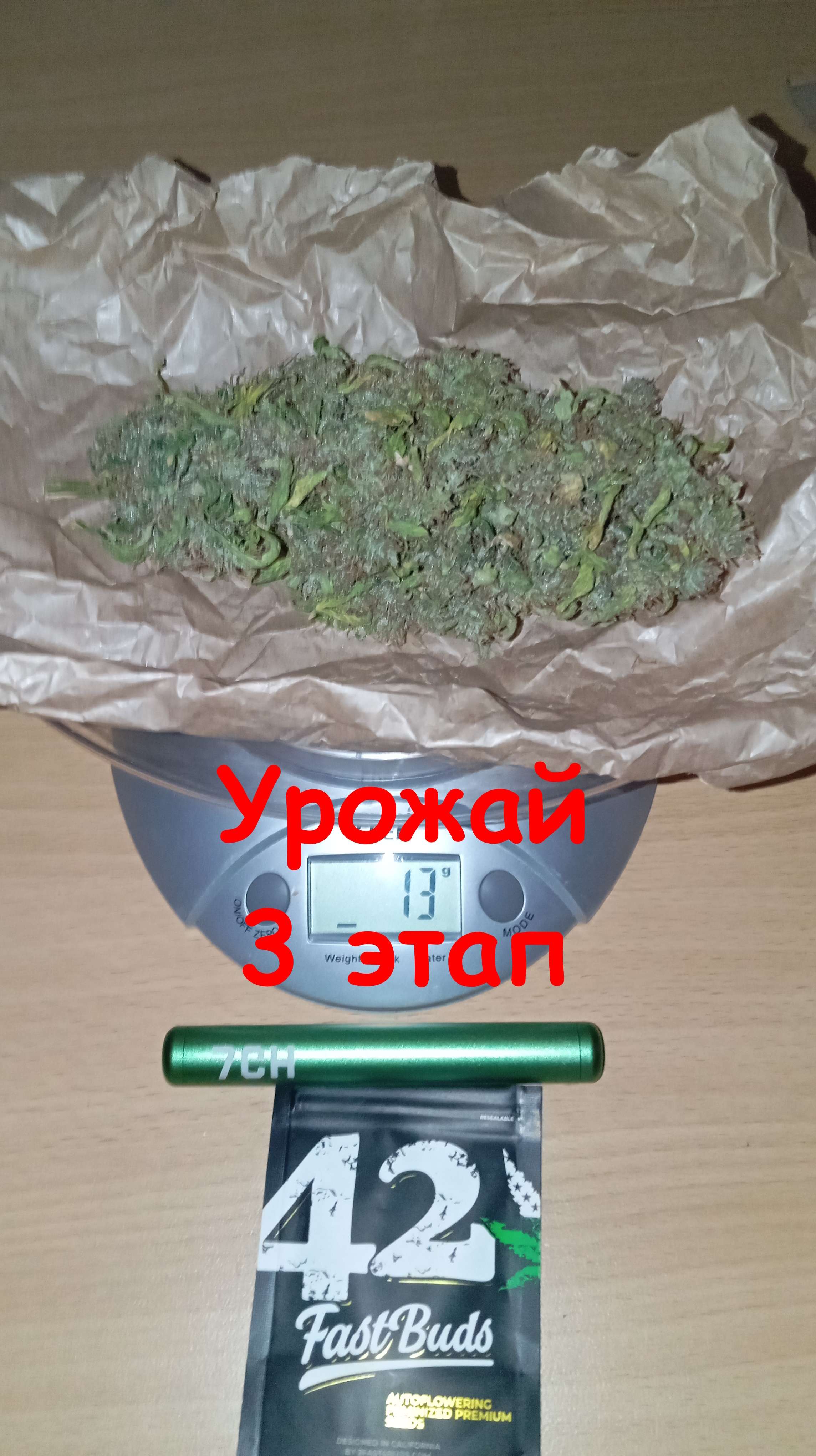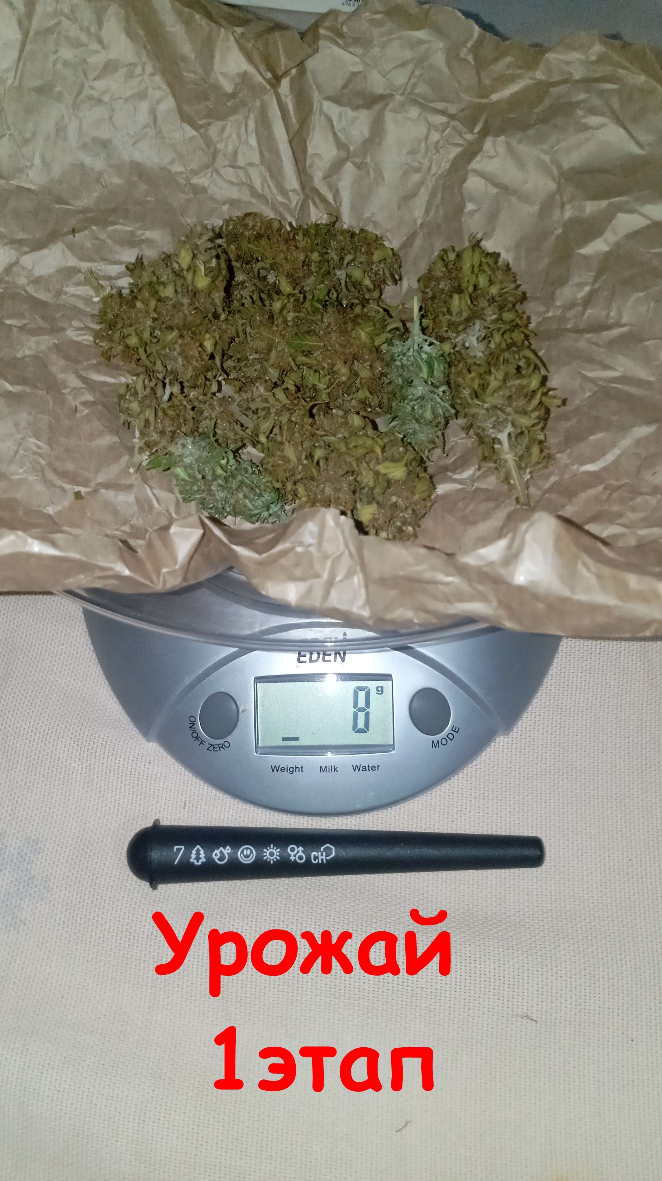 Сырой 255 гр, сухой 61 гр. Считаю это весьма хорошим результатом учитывая сетап оборудования - 7 литровый горшок, свет 60вт от МФ и бокс размерами 40х40х90см.