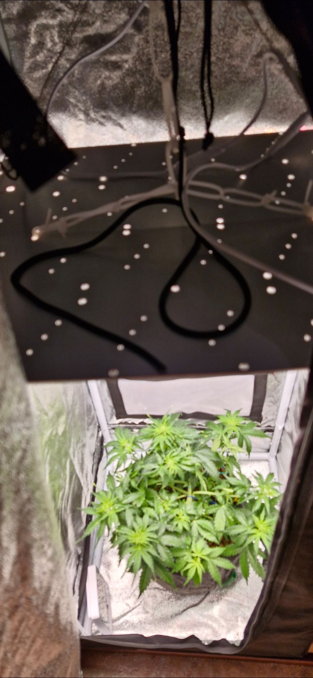1) Полив сначала водичкой 500мл, чтобы минимизировать ожоги, потом следом с удобрениями, по табличке для вспышки роста(цветение) даю 1/4 дозировки, плюс бустеры и фульвокислоты. Фотографии будут позже т.к. заполняю заранее всё. Подрасстянул ещё чуток. У нас ещё предцвет. Думаю недельку полторы ещё будет точно. Фото прилагаю. Соединил две лампы в одну. Жарят 50к lum но как показал прошлый гров это не так уж и страшно. Понаблюдаю ещё завтра посмотрю на предмет передозировки, и световых ожогов. 2)Сегодня глянул на предмет скрутки и ожогов листьев. Всё очень хорошо. Ничего не растягивал уже некуда тянуть. Думаю через полторы недели зацветём, и тогда сниму резинки. Интересно сколько на цвете наберёт роста.