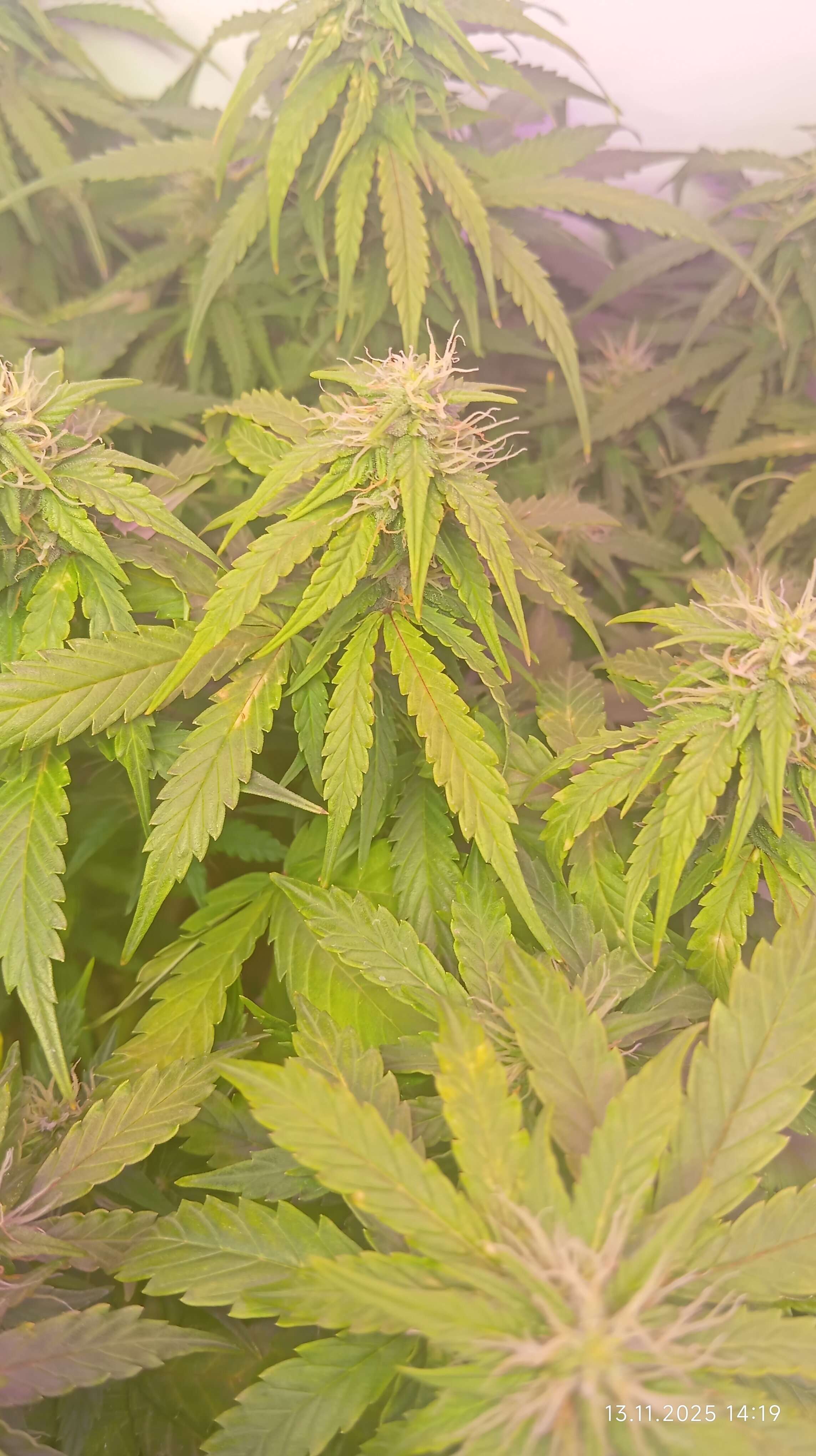 Вот и началась 9 неделя Поливаю по 2 литра раз в 36 часов ТК выпивает всё до капли , единственное заметил светлые пятна по центру листа ,шиши начинают набухать ,видна как тризомы облепляют шиши ,сгорела одна лампа на досвет,доезжать будем так.