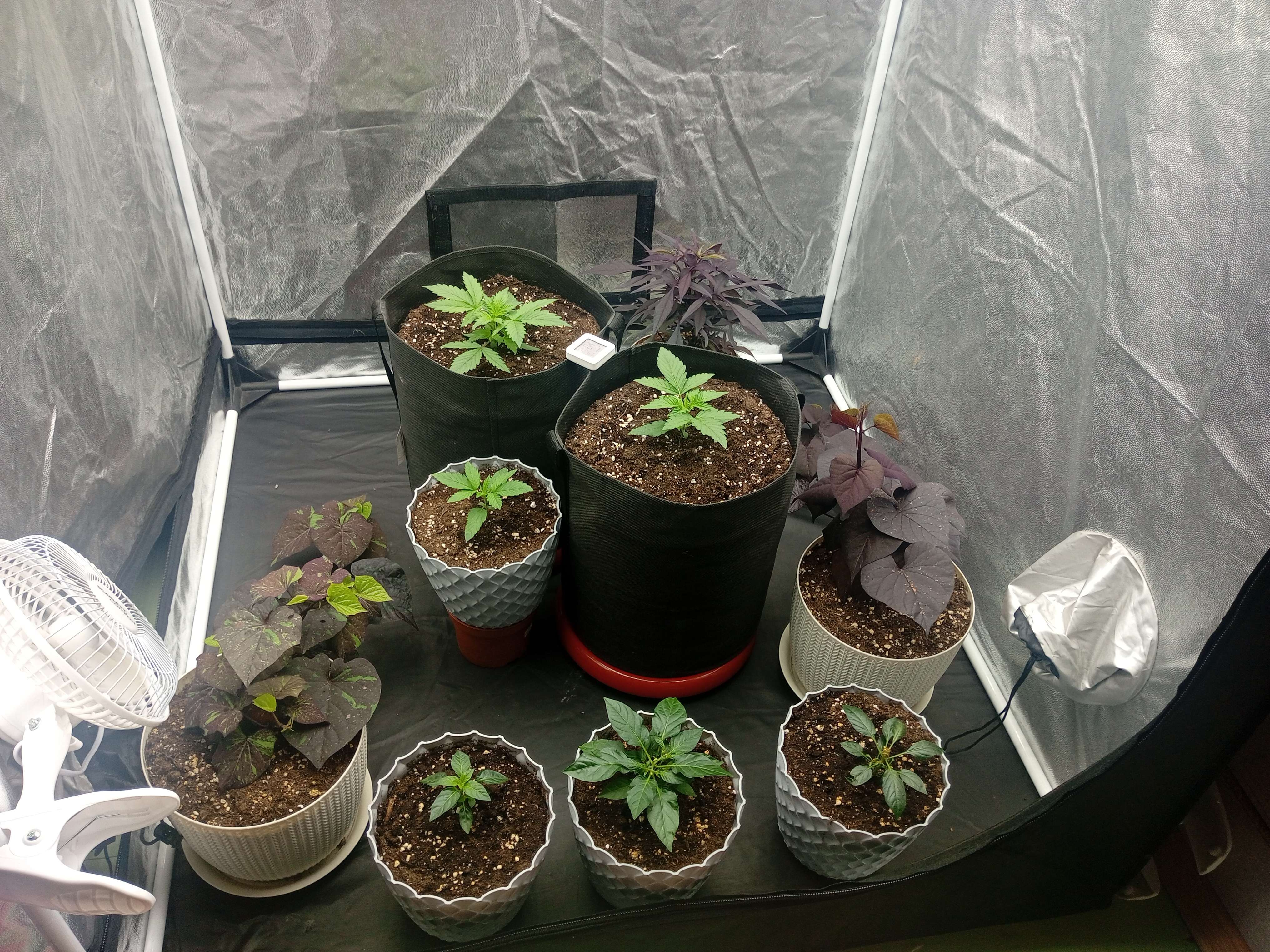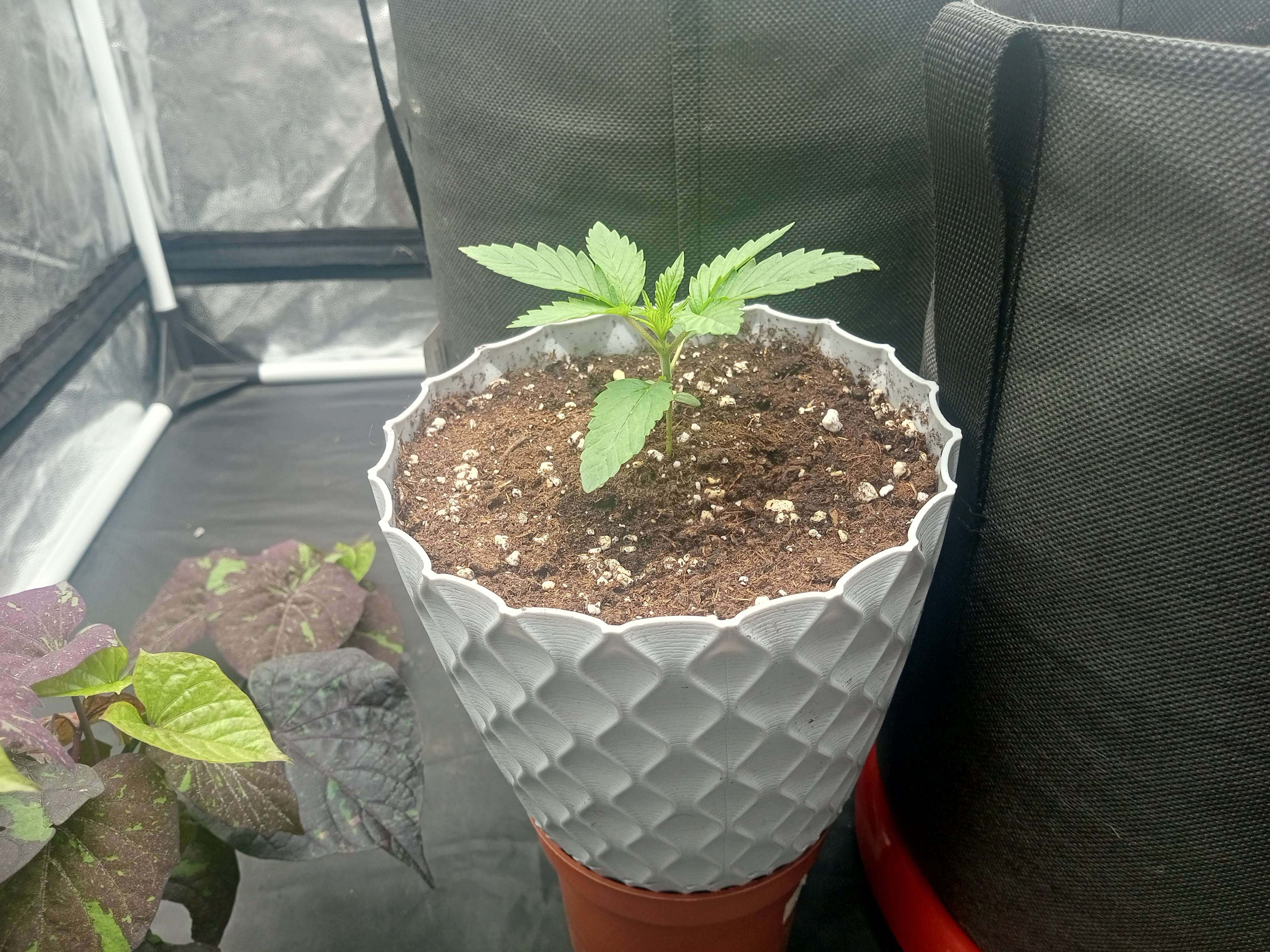 Я чёт сегодня паникну'л. Решил, что грунт слишком влажный и вынес на пару часов на улицу саженец свой. Тот простых немного и вернулся обратно в палатку. Думаю, это движение было лишним, но кто знает...