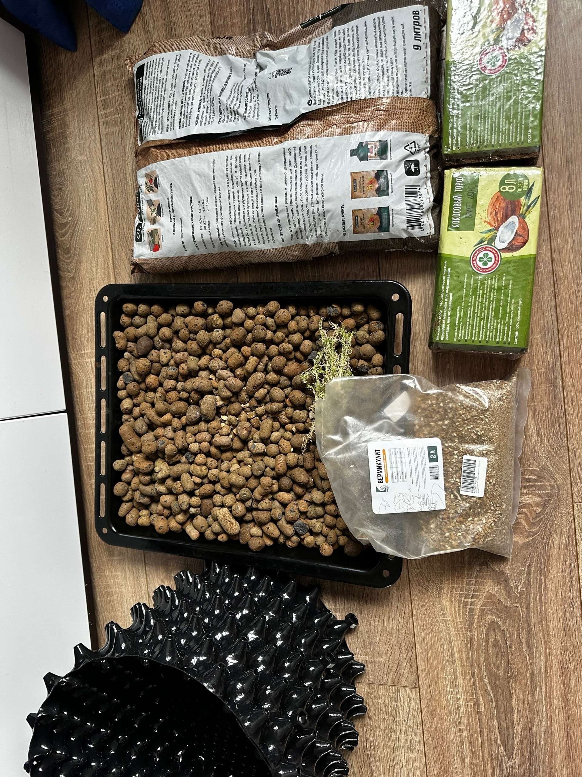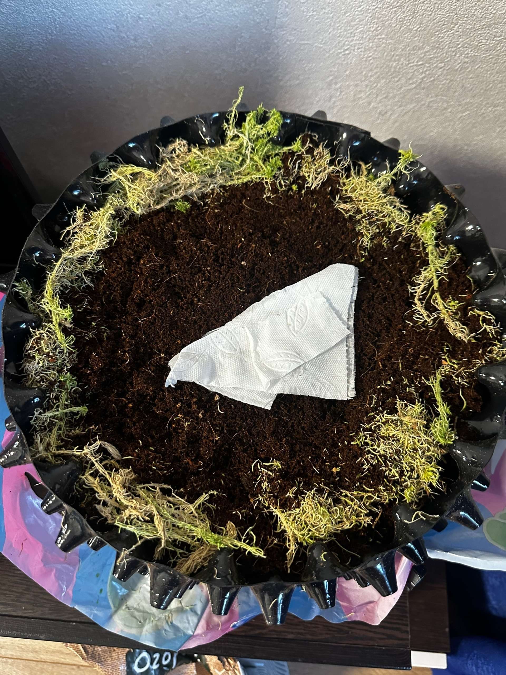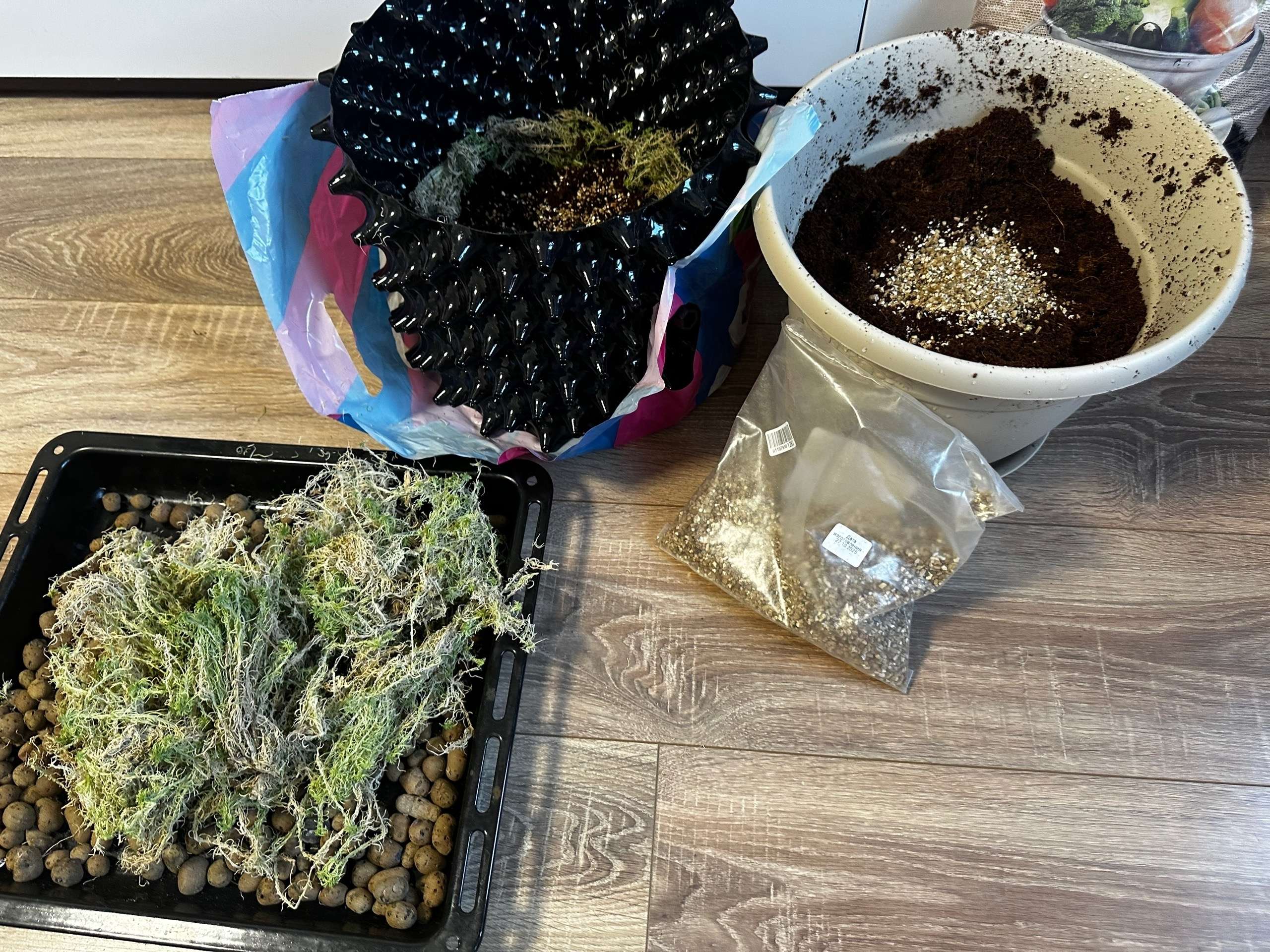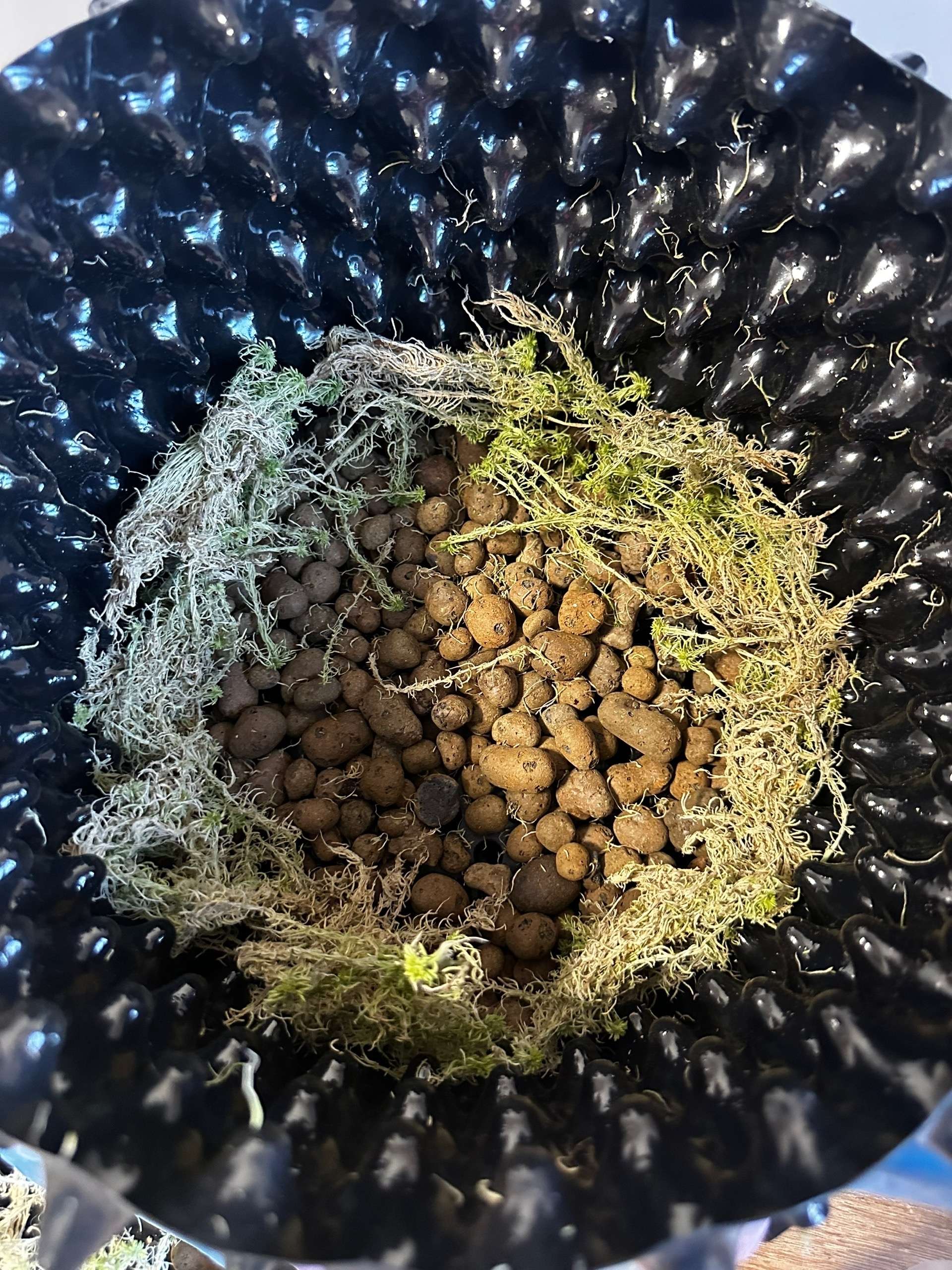Первый горшок будет экспериментальным, туда я снизу и сверху добавил мох сфагнум, который должен будет немного придержать землю снизу чтобы не валилась в здоровые дыры и, являясь природным антисептиком помочь в борьбе с плесенью(возможно, я так решил хз почему). Второй горшок без сфагнума, буду сверять результаты.