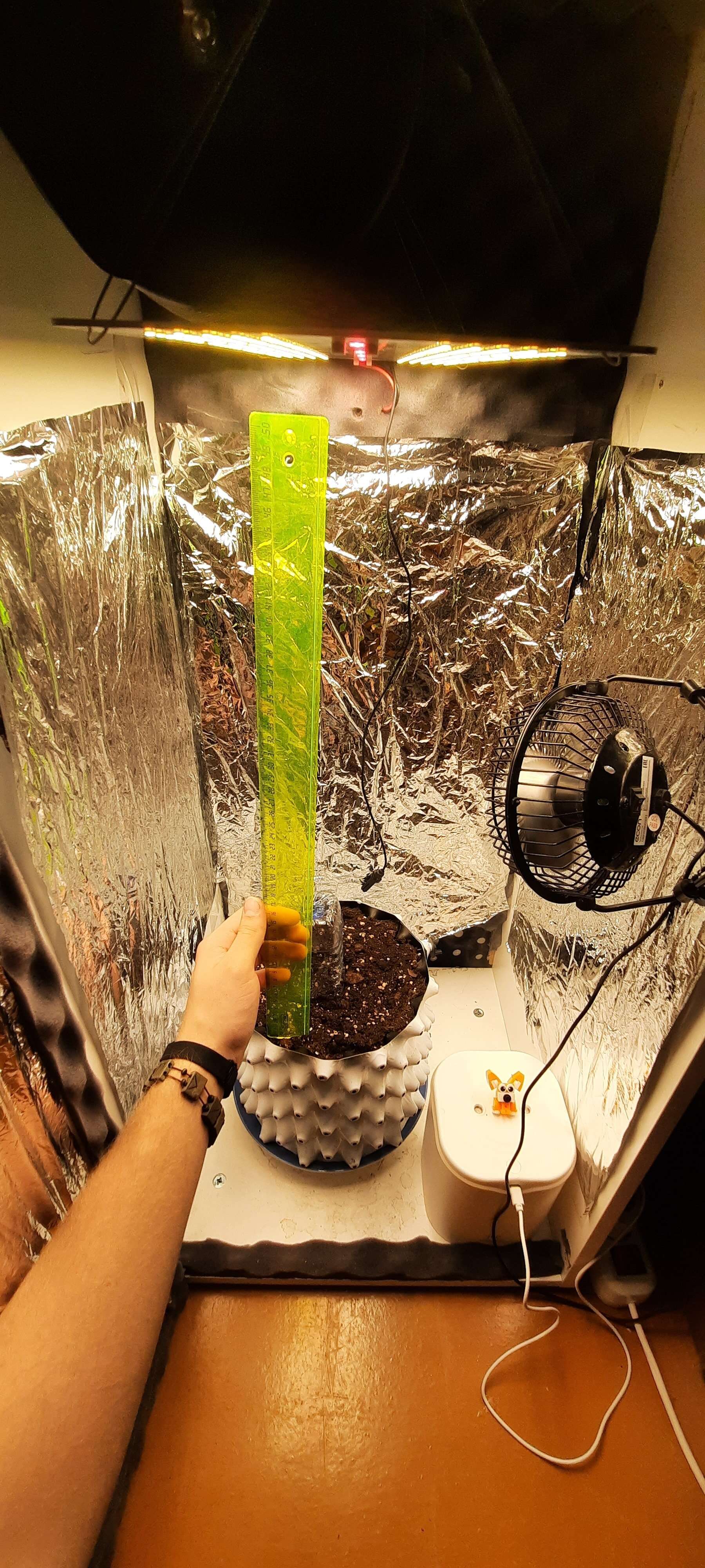 Лампу выше ставить не стал, слишком уж много мороки будет, отодвинул в край бокса, люксов должно стать поменьше. Сейчас поставил новый увлажнитель с управлением с телефона,потому что нет возможности каждые 12 часов включать старый. Влажность будет держать на уровне 65%. Темпера 26-27° сейчас.