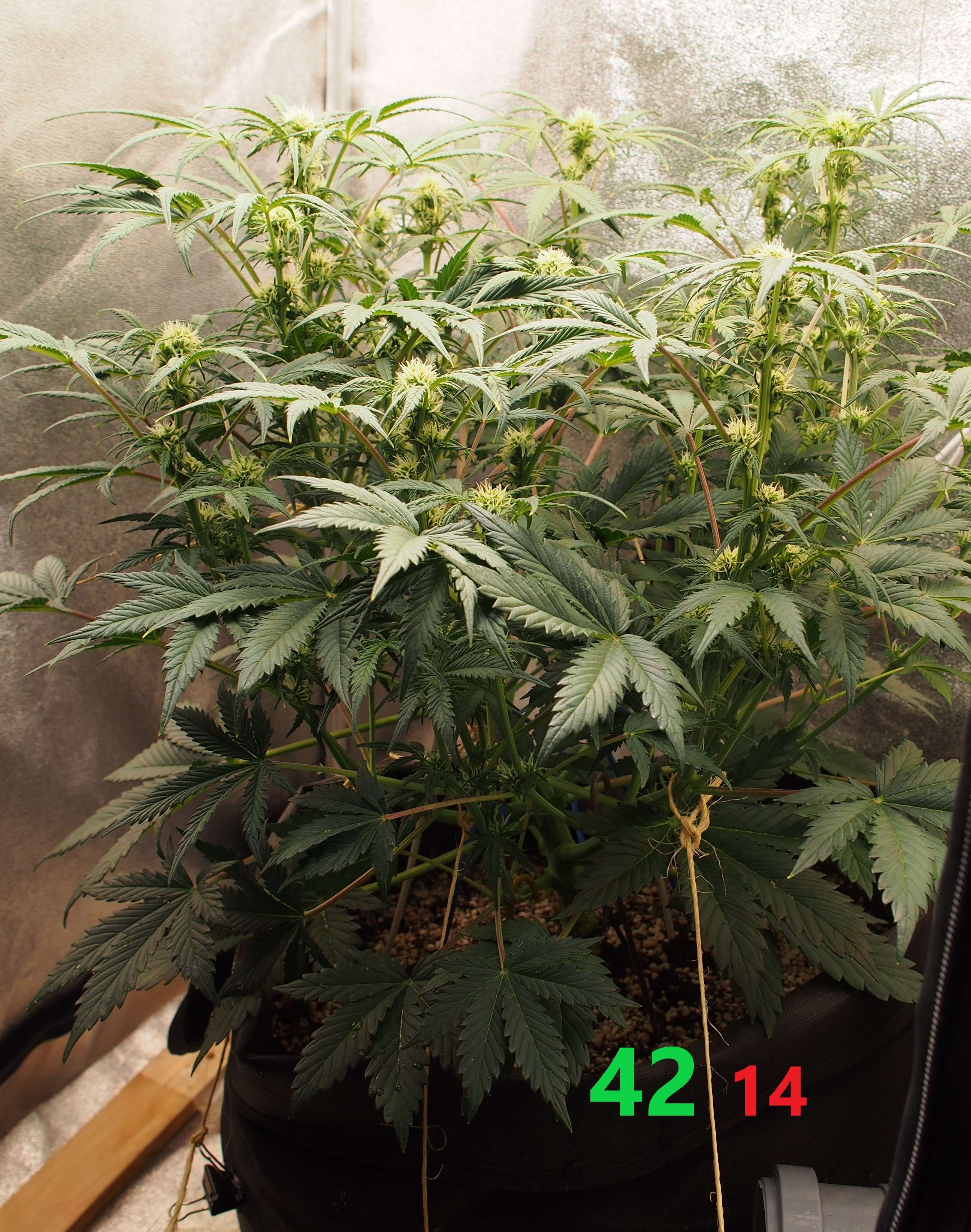 2-я неделя цвета. Растишка заметно выросла вверх - поэтому применяем только LST. Тянем главную колу вниз и стараемся создать несколько равных по уровню верхушек. Листьев много, но дефолиация минимальная - нет каких-то огромных лопухов, а резать кучу мелких листочков я не хочу.