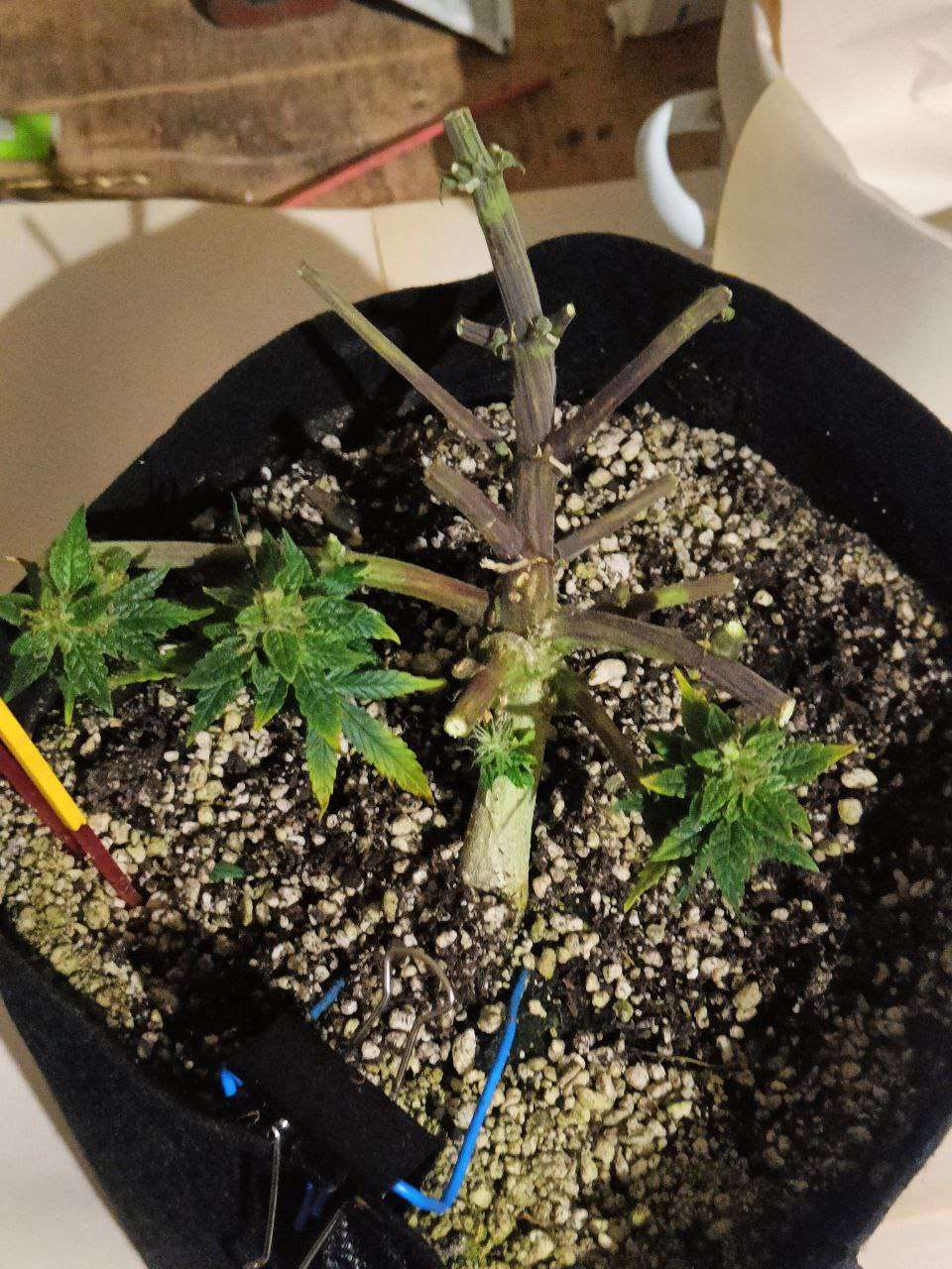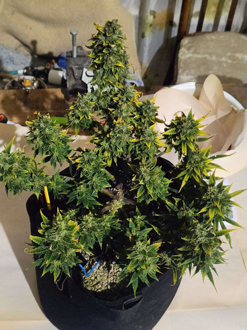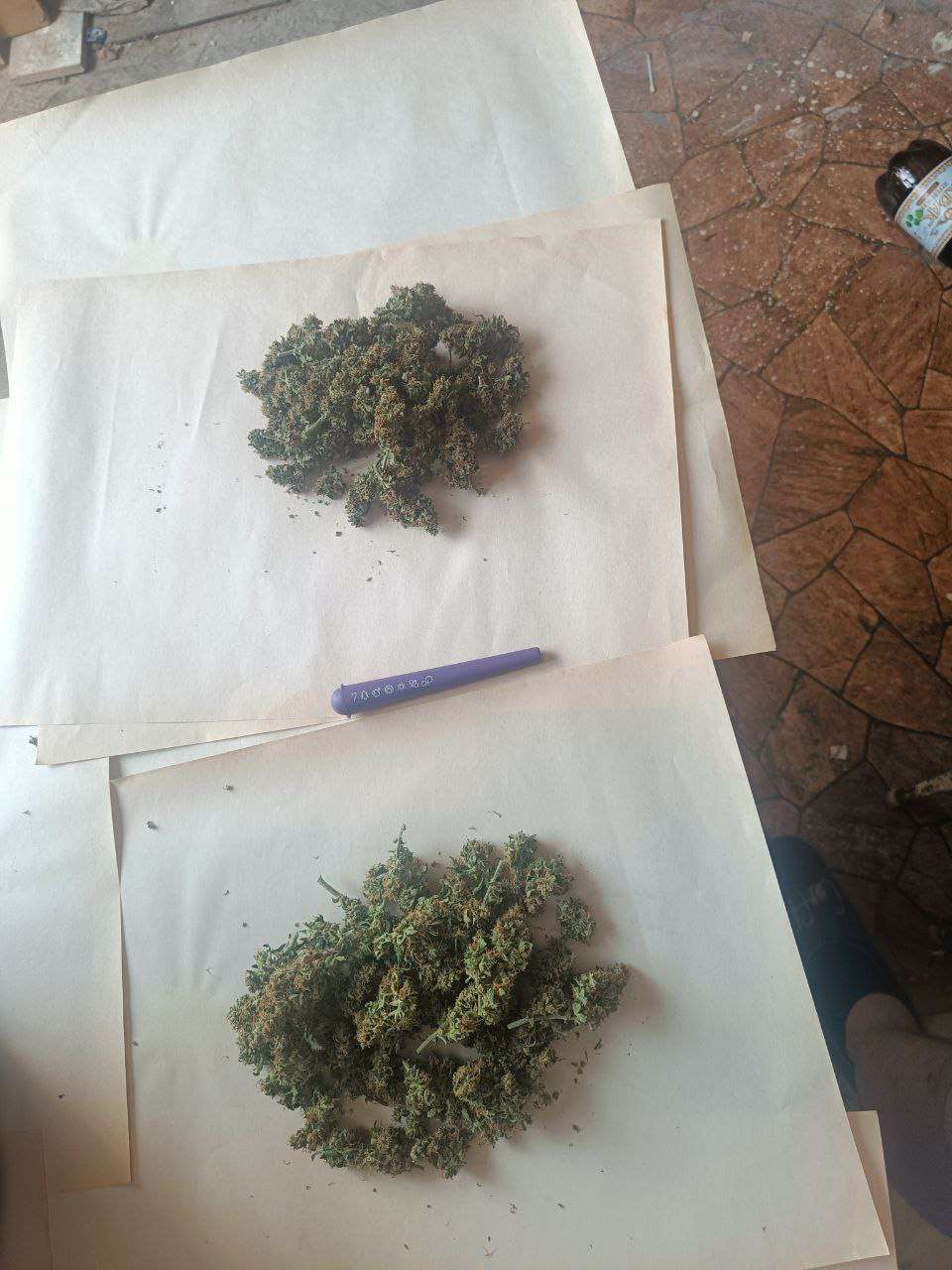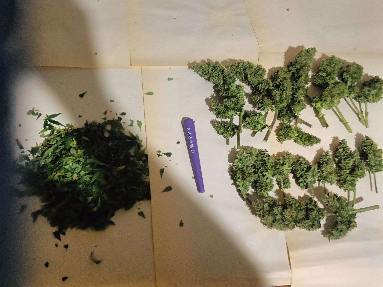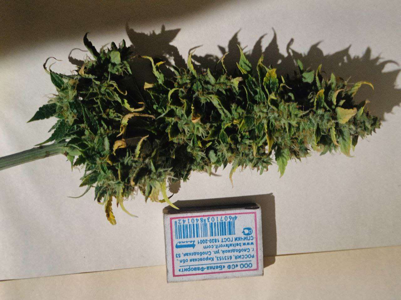 После того как они постояли в темноте 2 суток , при 38-40 % ,горшки были невесомые , подготовил стол , вытащил и по одному начал маникурить ,заняло у меня это около 6 часов, подвязал повесил в шкаф ,трим на бумагу,в боксе влажность от 45-50 %, у самих подвязаных сначала было 73-65-61-55 % и снял,веточки ломались но чуть волокна оставались, порезал на мелкие составные ,помястил в банки убрал, сухого получилось по 25 грамм каждого, трима еще грамм 8 может осталось, всю сушку не трогал не подходил особо только следил)