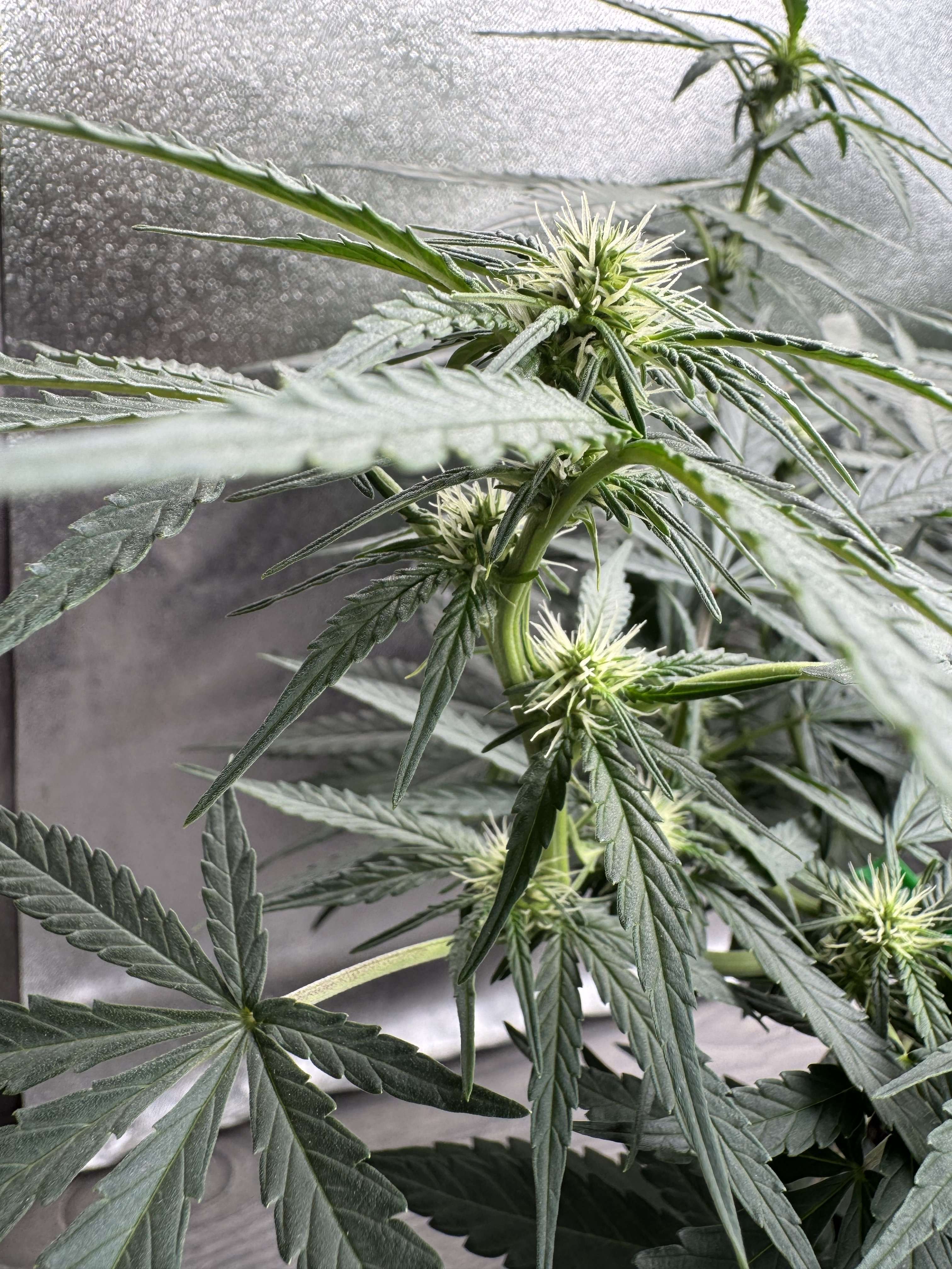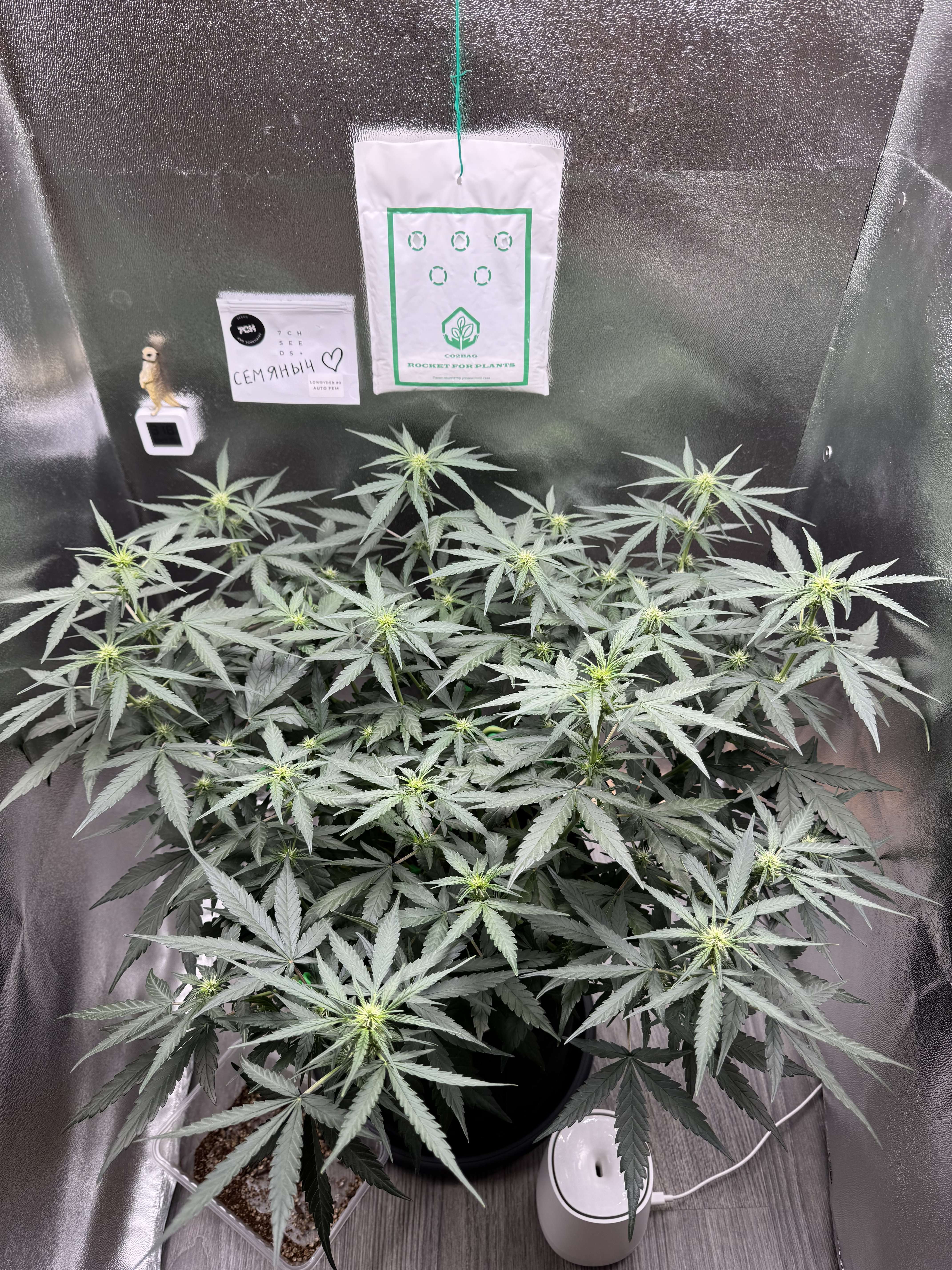 1-2 фото Провел повторную обработку от клещей Фитоверм + зеленое мыло. Можно считать борьба с ними вроде как завершена. Кустик хорошо разросся, даже пришлось двигать боковую ширму. Решил повесить CO2 пакет, хоть и не вижу смысла в нем, так как окна открыты, но пускай будет. Провел еще одну маленькую дефолиацию, убрал парочку листьев в центре.