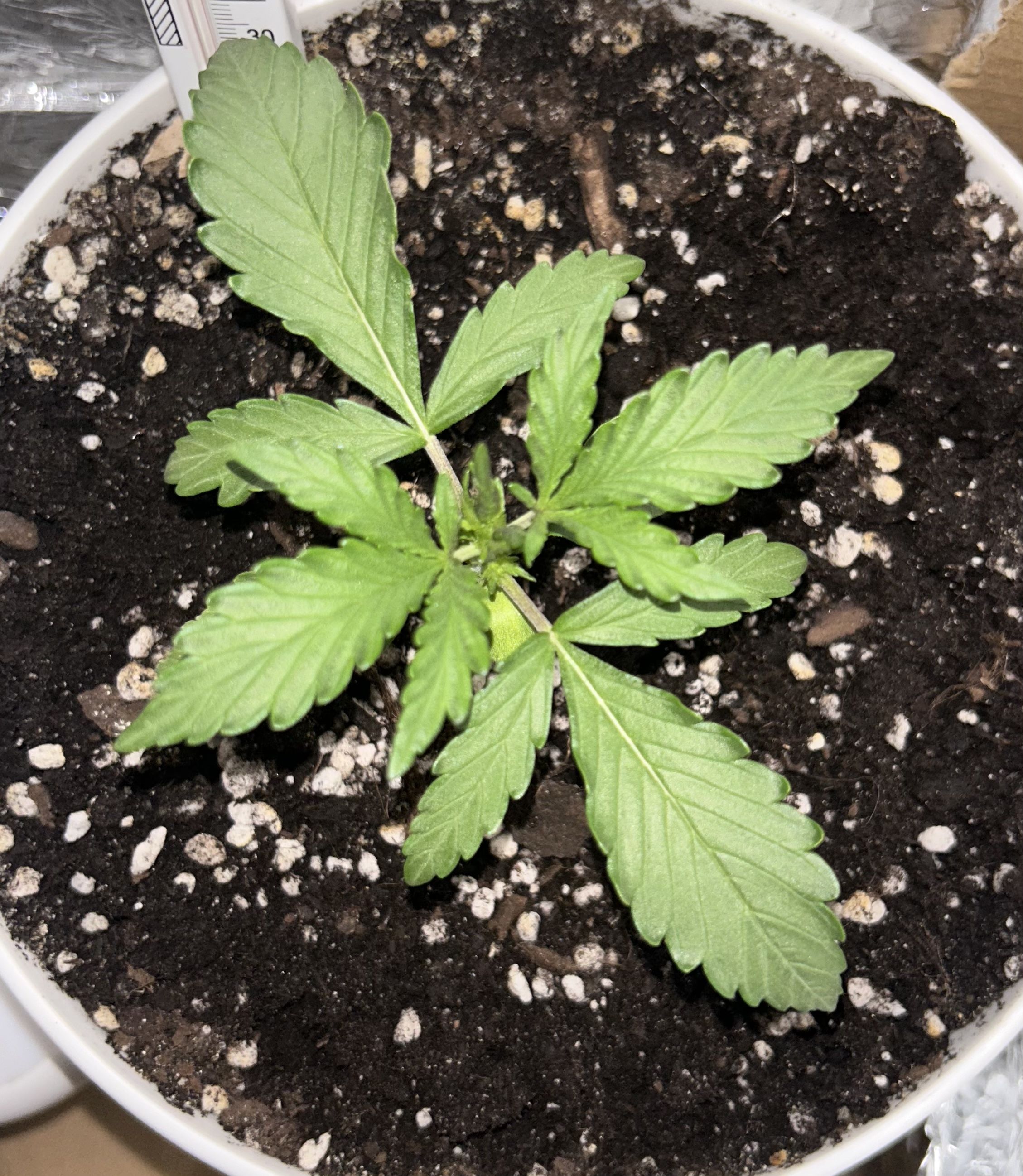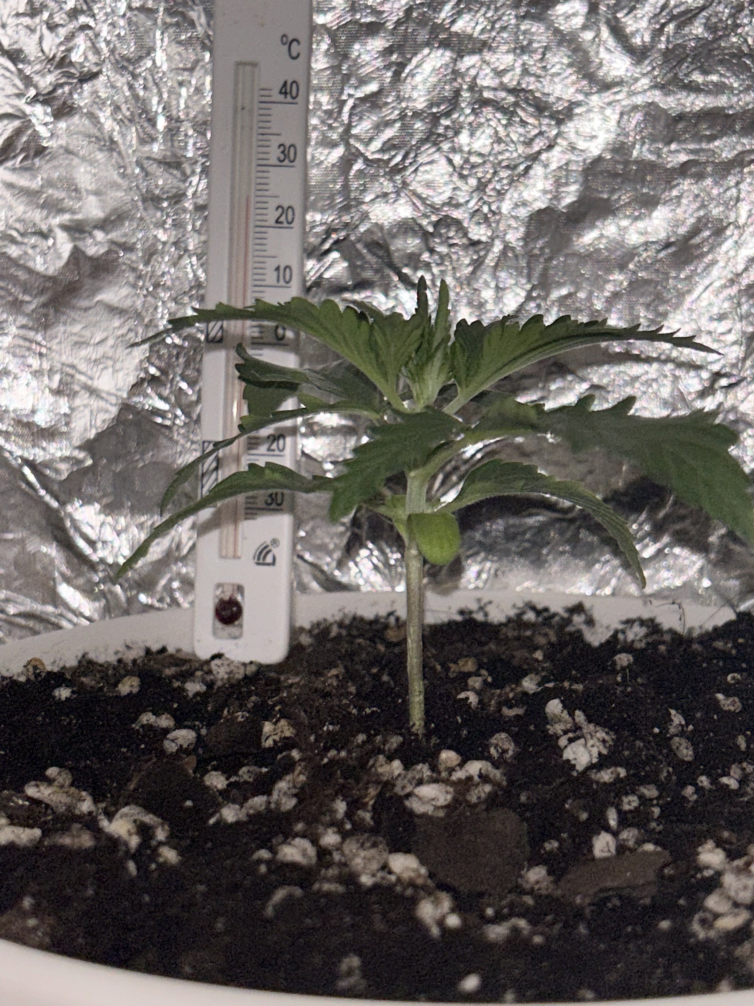 добился стабильной температуры в 25~ градусов и влажности в 40-50%, кустик начал бурно расти.
