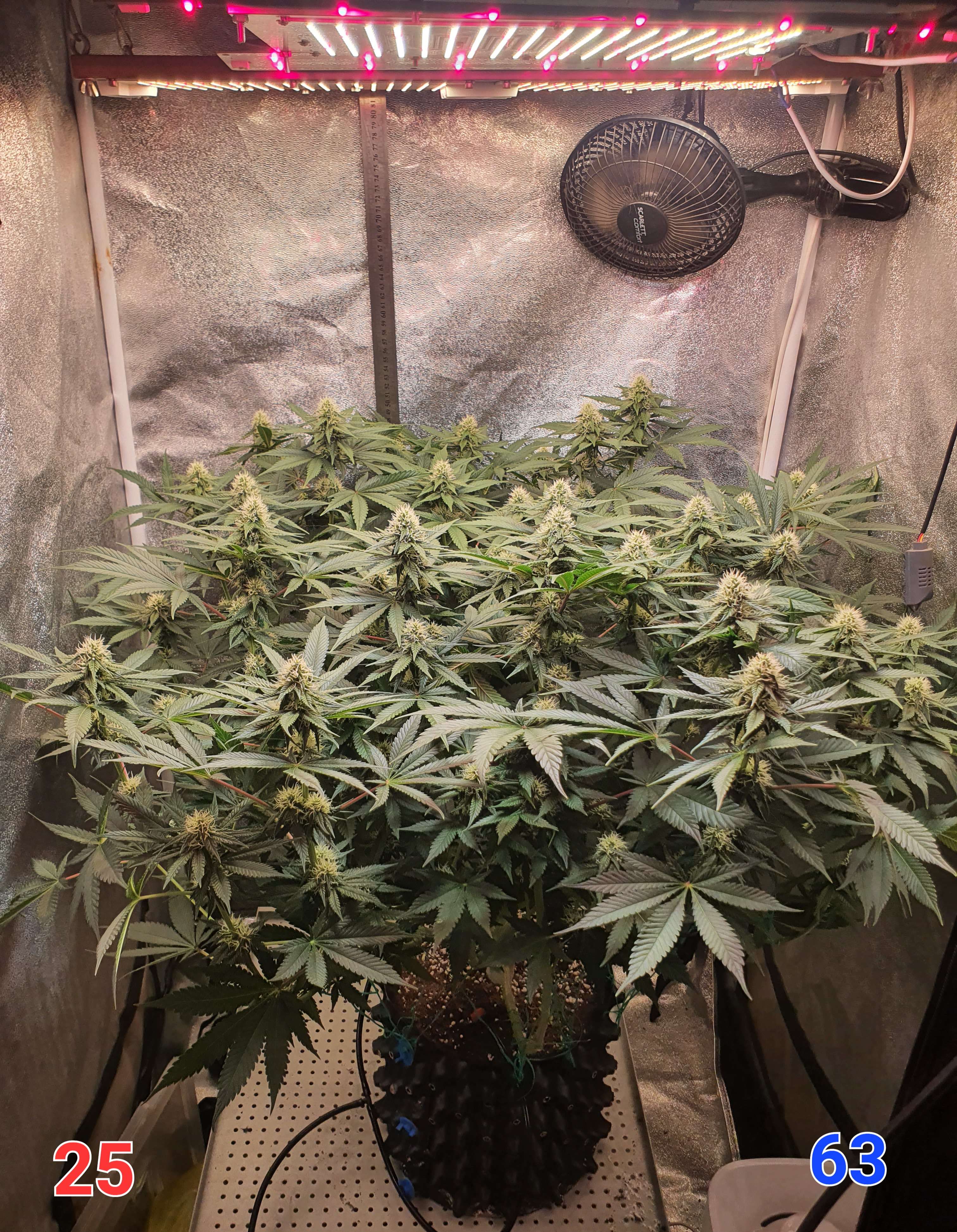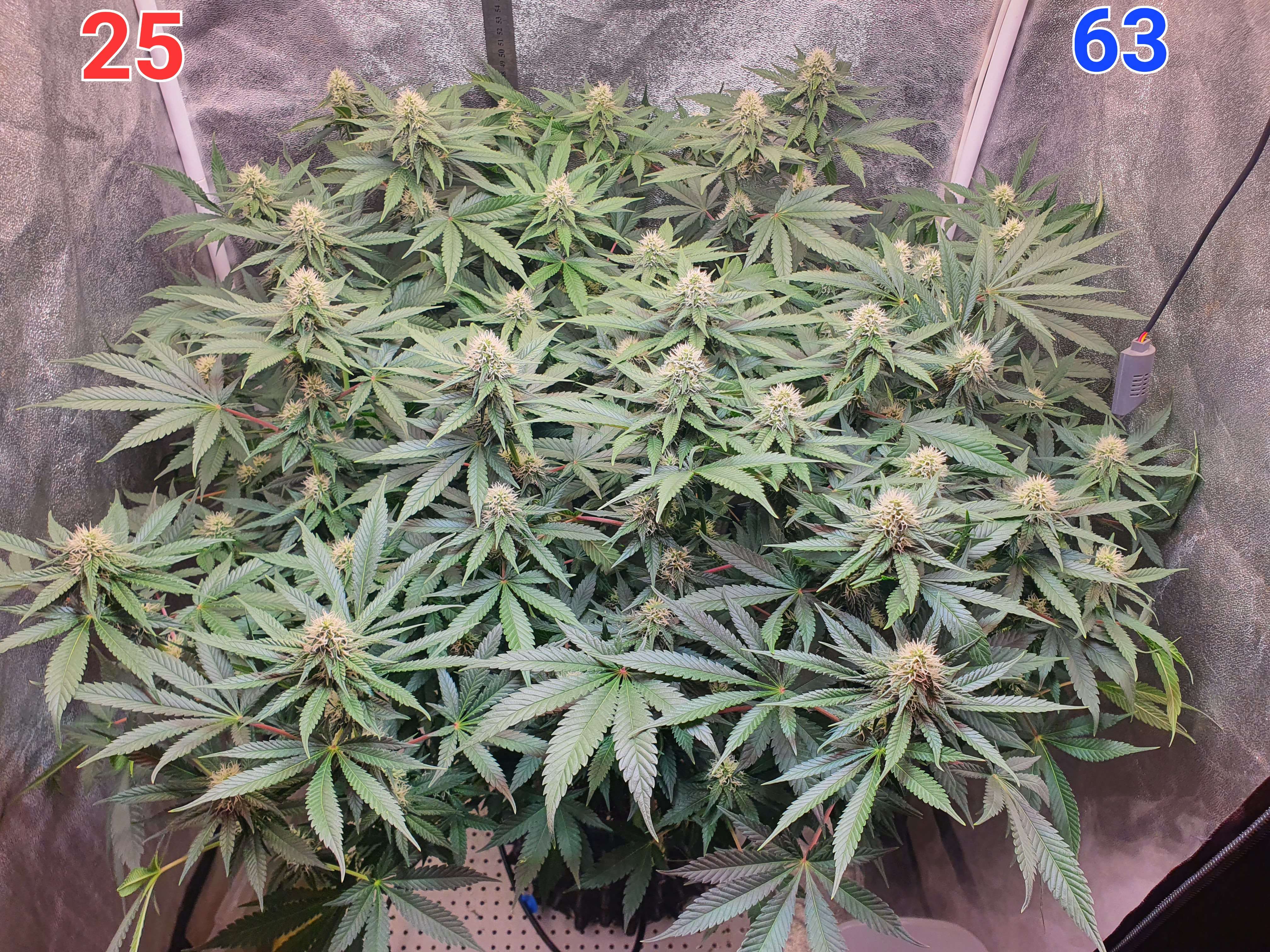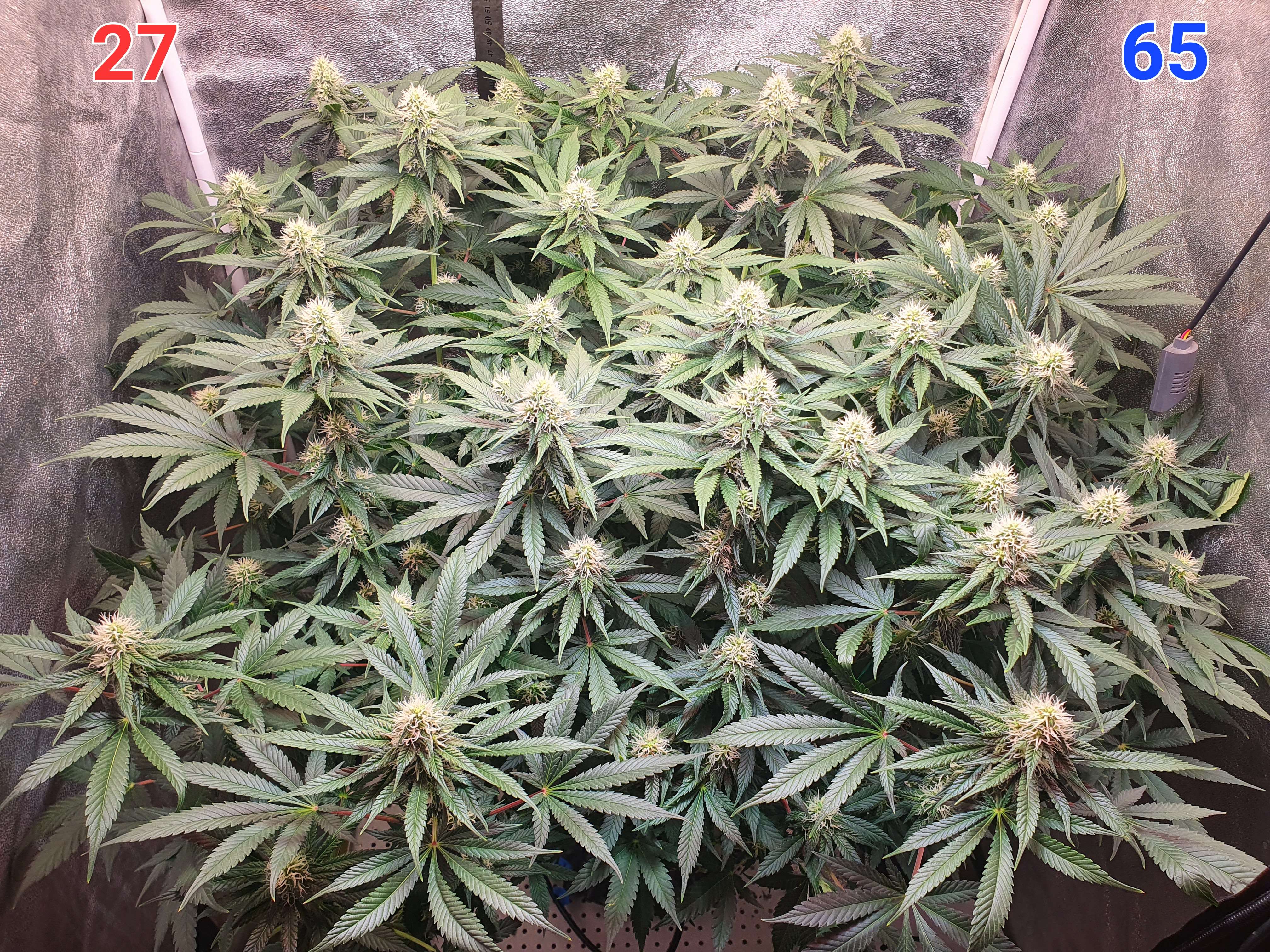 У тебя не возникало идеи, что тут будет эффективным лоллипопинг? Соцветий много - это кажется прикольно..но, нижний ярус этих соцветий почти не будет набирать массу. Я сейчас с такой же ситуацией столкнулся и пожалел, что мало посрезал с нижнего яруса. Условно, их можно уже поделить на 3 яруса: центральные колы, середнечки уверенные и ..попкорн снизу. Всегда жаба душит резать вроде как хорошие соцветия.. но, больше 12-18 кол - кустик просто не может нормально потянуть. Остальные становятся уже обузой малоурожайной. Я в следующем грове буду беспощаднее к нижним соцветиям.