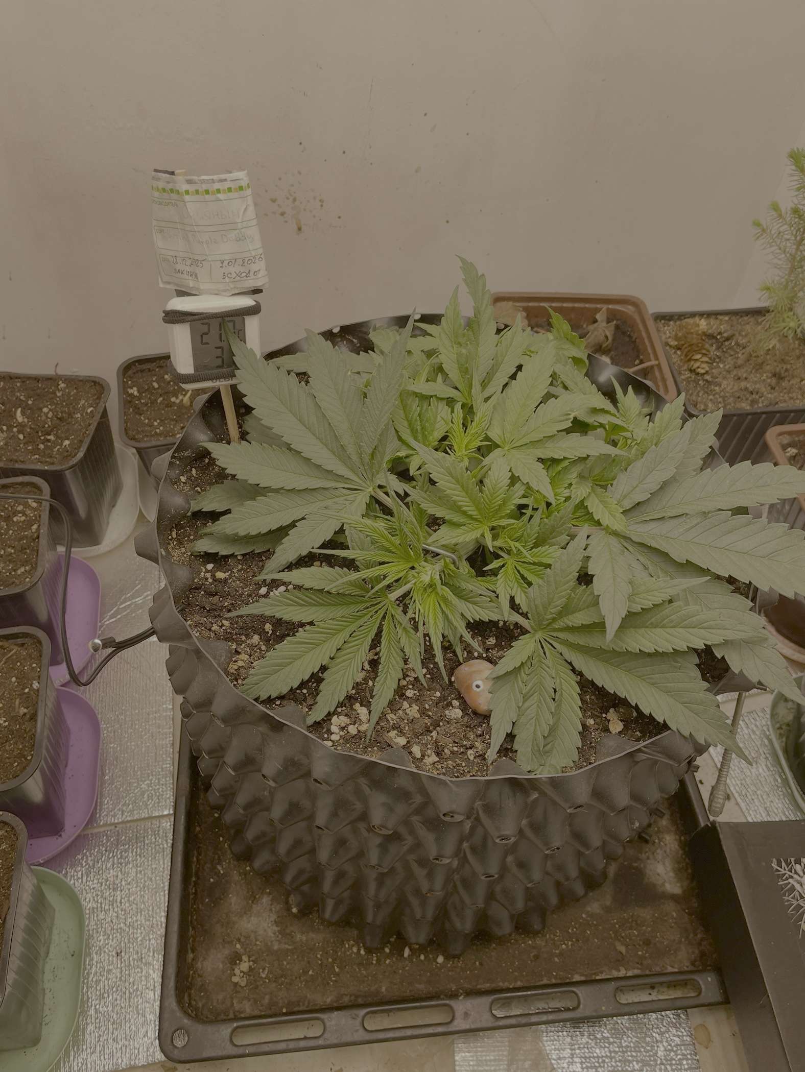 Так что могу сказать вчерашний полив был лишний и я отломал листок нечайно, куст уже издает запахи думаю этот гров без фильтра не обойтись, немного уныла девочка, но нечего, пришла разетка с термостатом настроил на 20-28 градусов будем наблюдать…