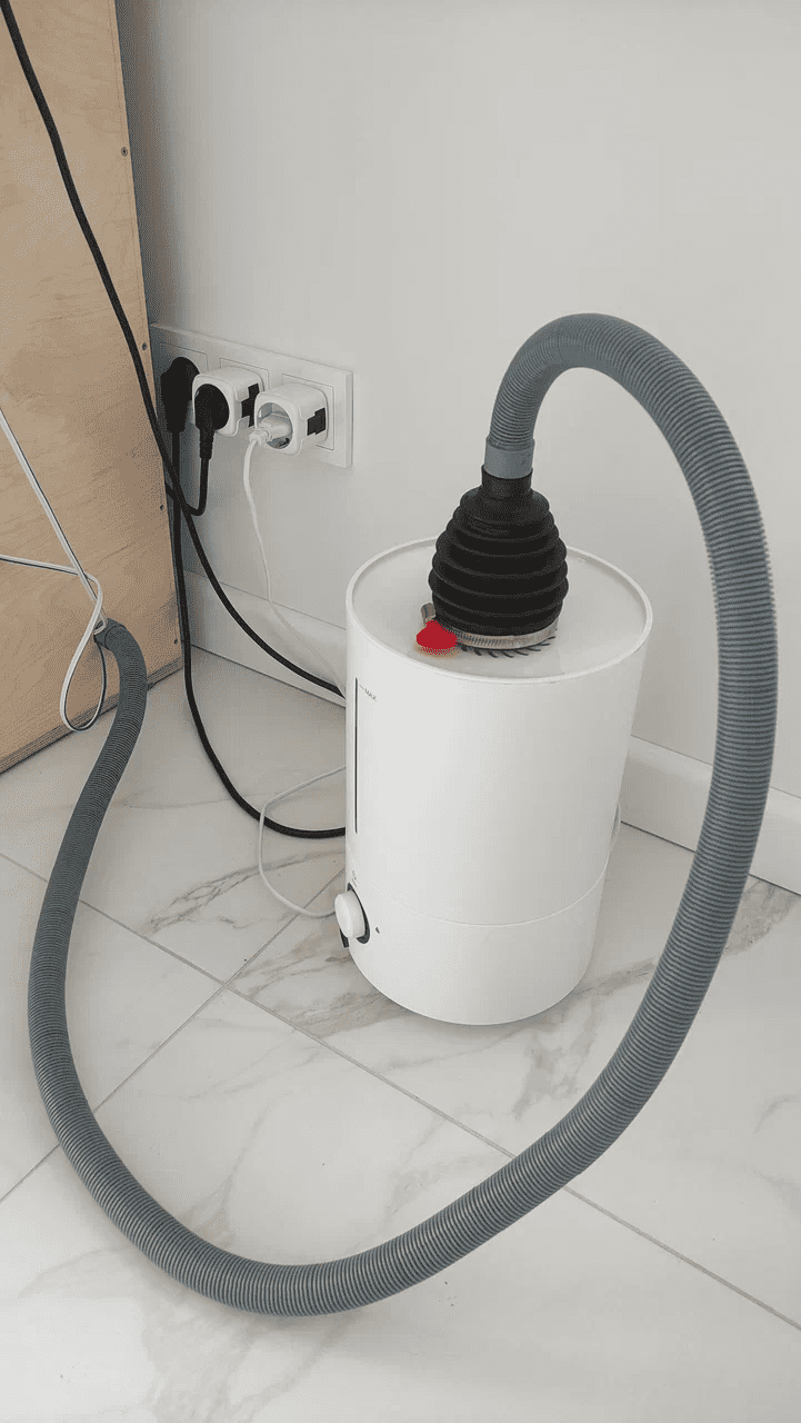 Да, не хочу им место занимать в боксе. Нашел у себя старый пыльник от ШРУСа, очистил его. Он аккурат наделся на увлажнитель, потом соединил нужные дырочки шлангом от стиралки. Внутри под выход шланга контейнер поставил для сбора конденсата. Работает отлично.