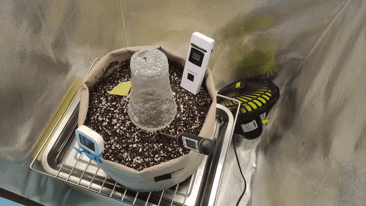 Свет выставлен на минимум диммером. Подставками выставил высоту таким образом, чтобы у поверхности горшка свет был 180 ppfd (12k lux) - теперь есть PAR-метр, поэтому опираться буду на него, а люксы буду измерять в дополнение к ppfd. Так бокс будет меньше нагреваться. Первые дни свет включен на постоянку, как только начнут развиваться корни, добавлю "ночь".