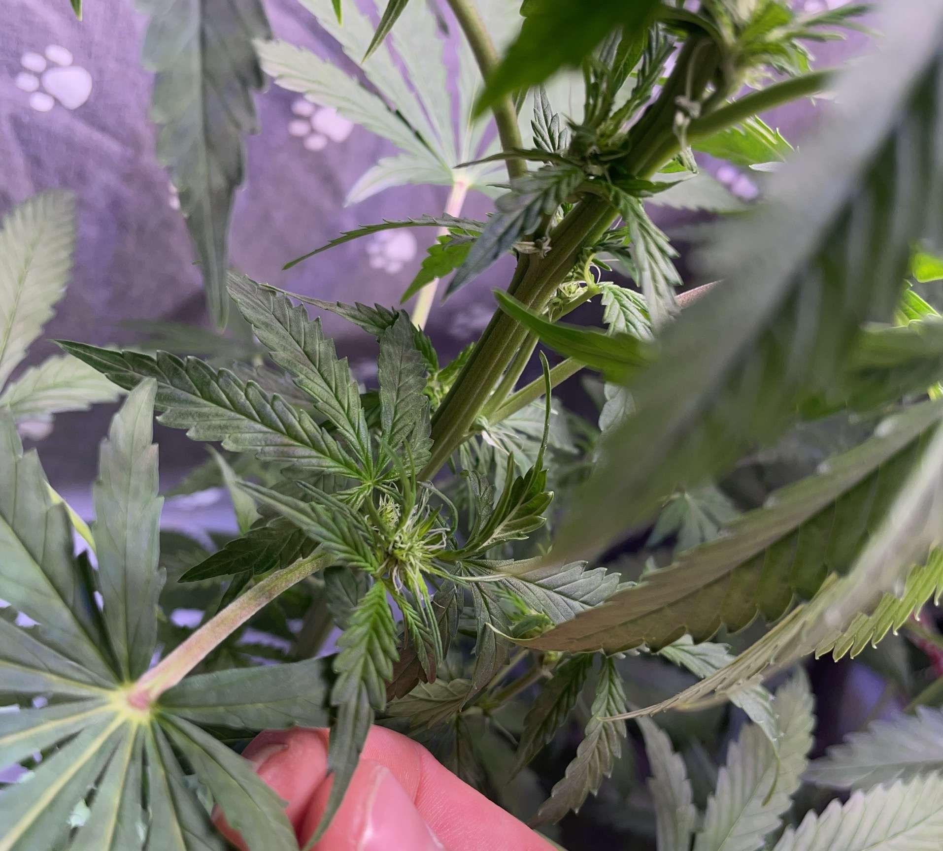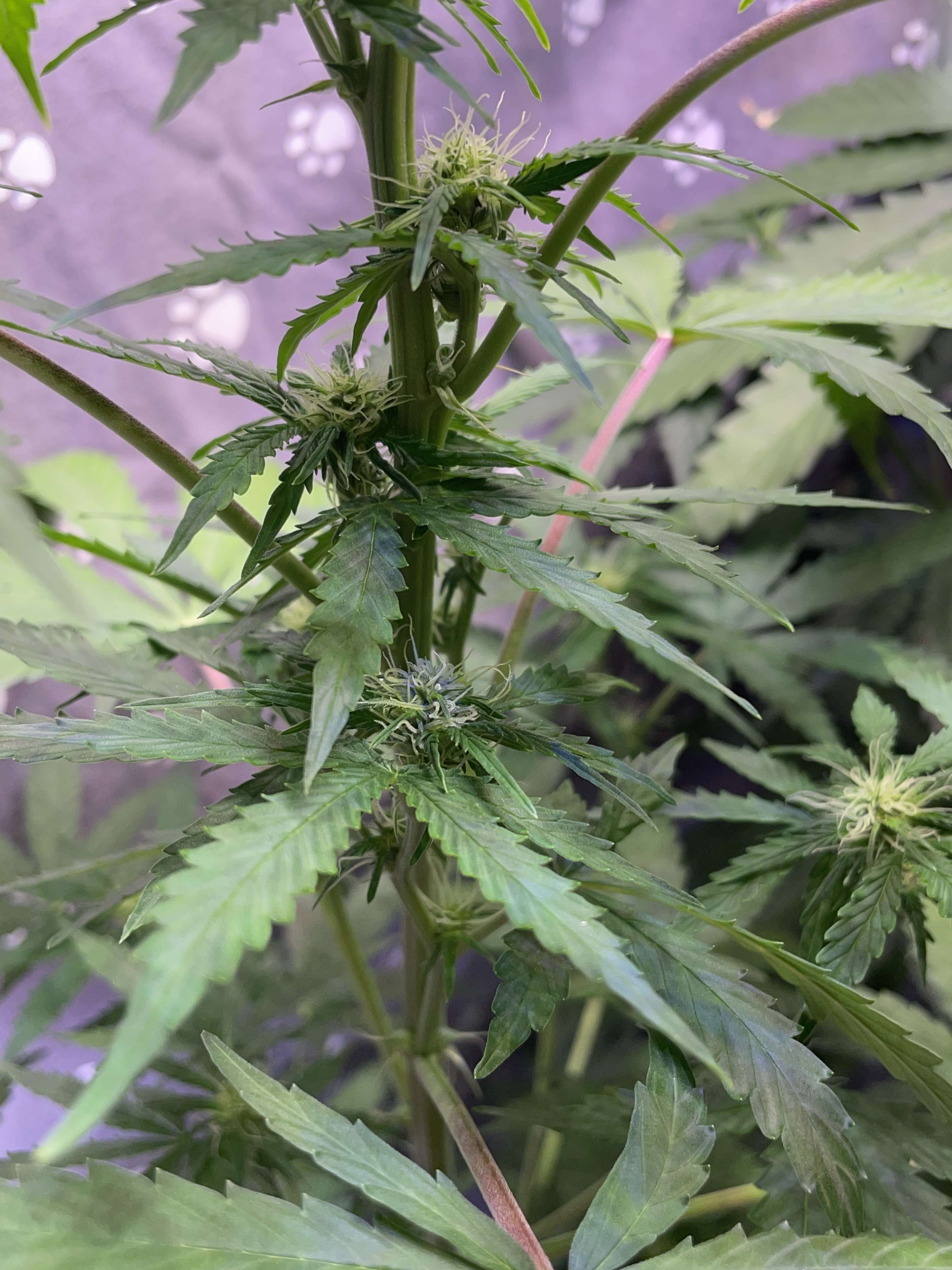 Все что фиолетовое есть на растихе это дефицит фосфора, сама себя ест. Замеряй пш почвы чтобы был в пределах нормы 6,5-7, в идеале еще и ппм компота замерять, чтобы все усваивалось как надо. Фосфор на цветении помогает формировать соцветия наращивать шишки, а калий в свою очередь способствует плотности шишек. Но у тебя еще проблема со светом так что бытовые лед лампочки в помощь. Я бы загнул по возможности основной ствол и сверху навесил хотя бы 100 ватт бытового леда что то типа 3шт по 30ватт. Ато по срокам уже цвести должен а у тебя он тормоза ловит, репы люблю-долблю наглядный пример что может быть при недостатке света, 15 недель роста и толком ничего не наросло. Хотя проблема решается действительно легко и дешево тем же бытледом, да это не топ но лучше чем ничего
